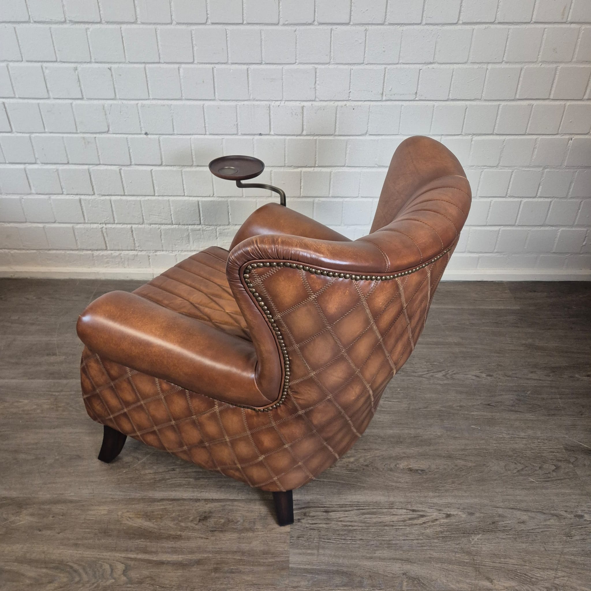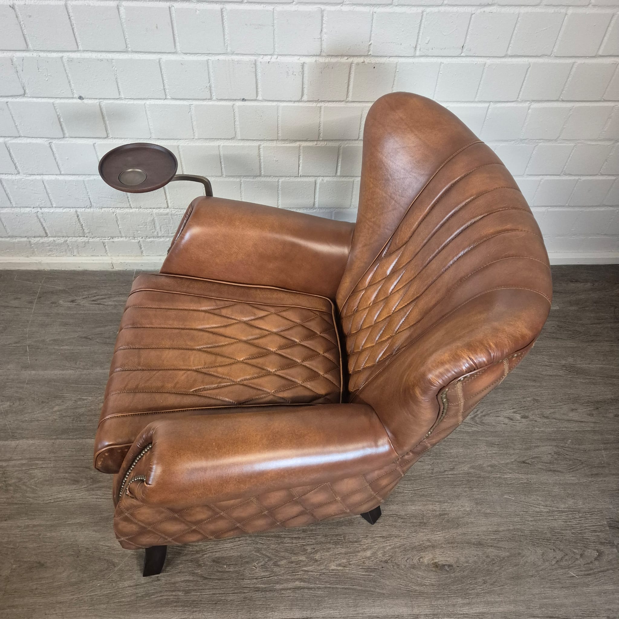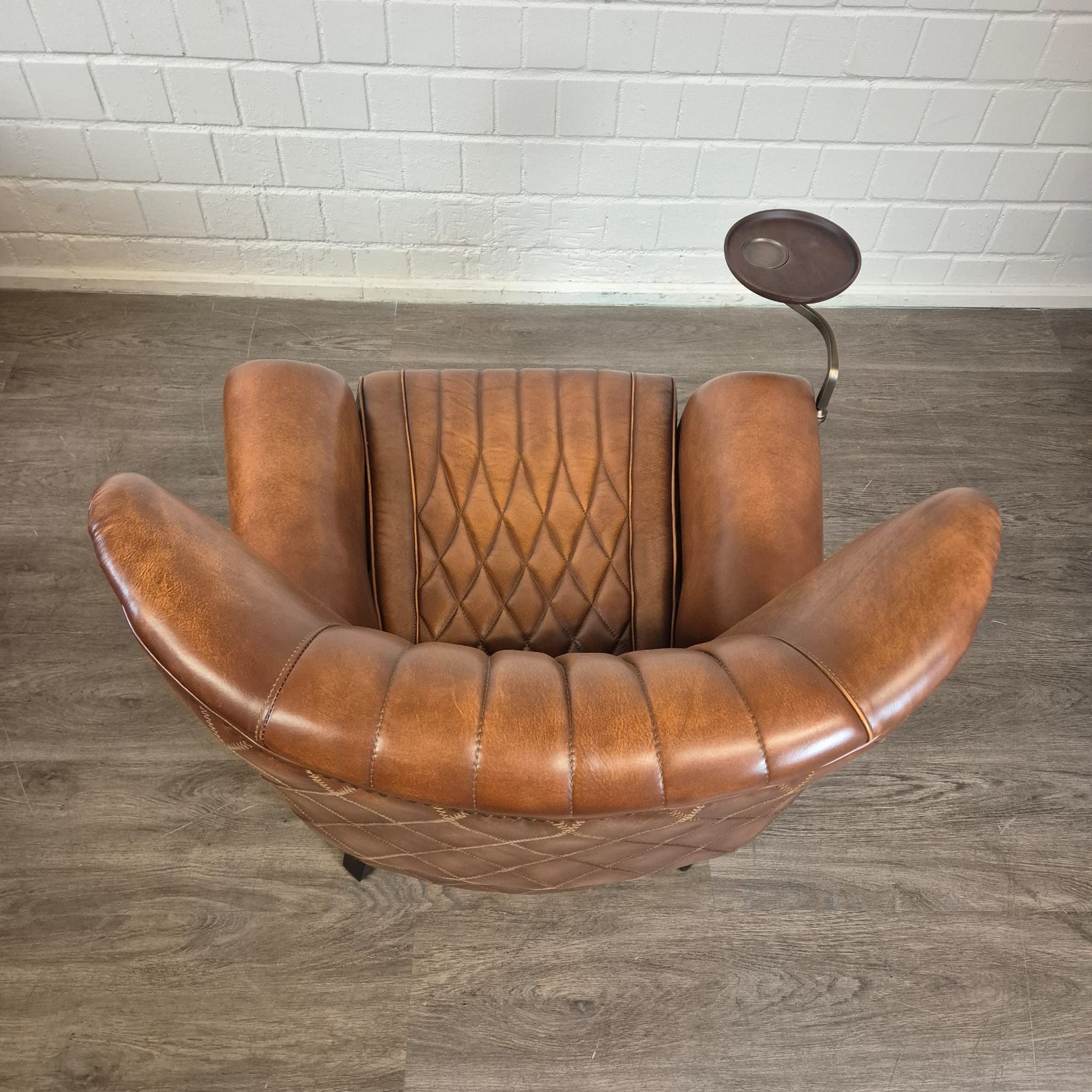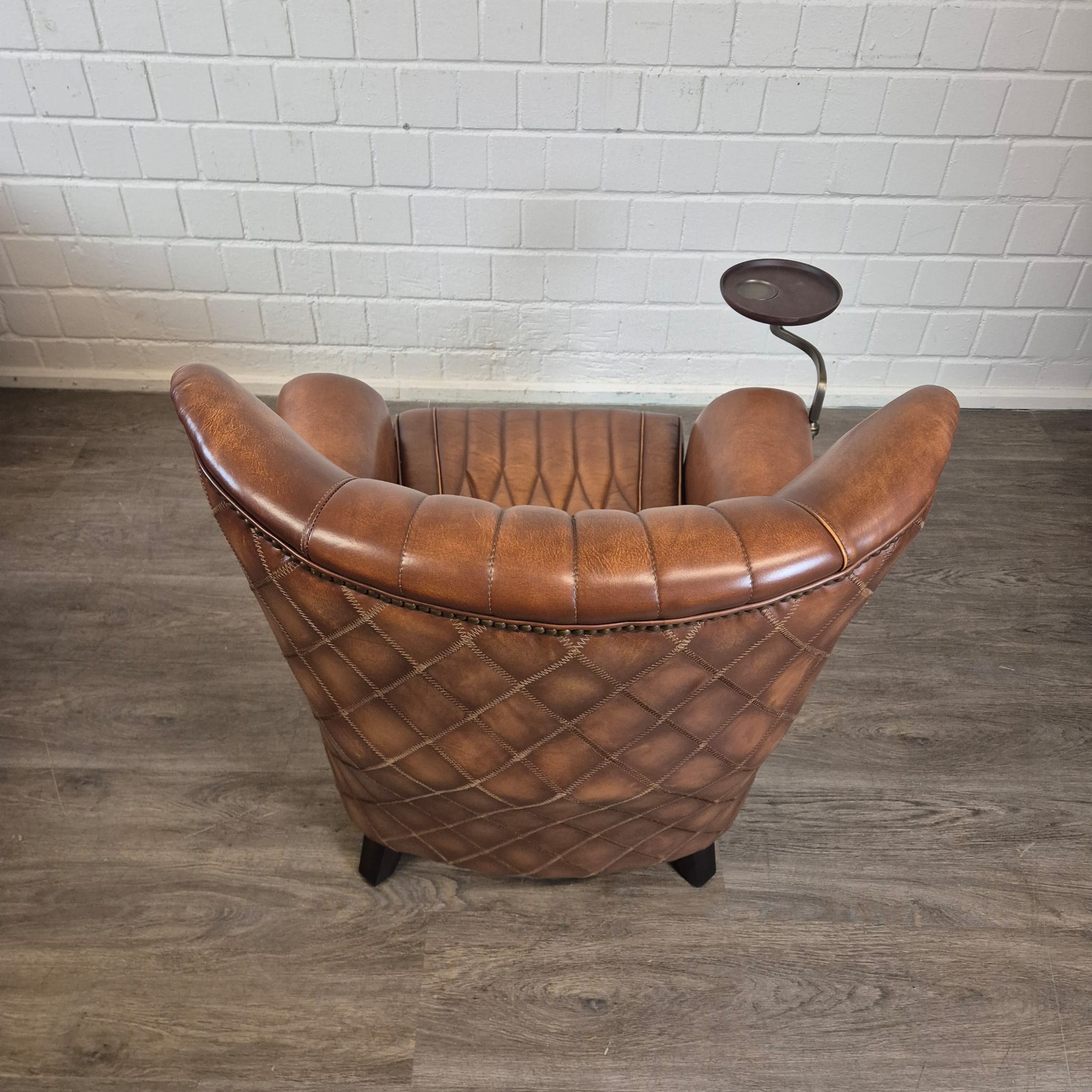 Exclusieve fauteuil met hoge rugleuning in echt leer en draaibaar dienblad