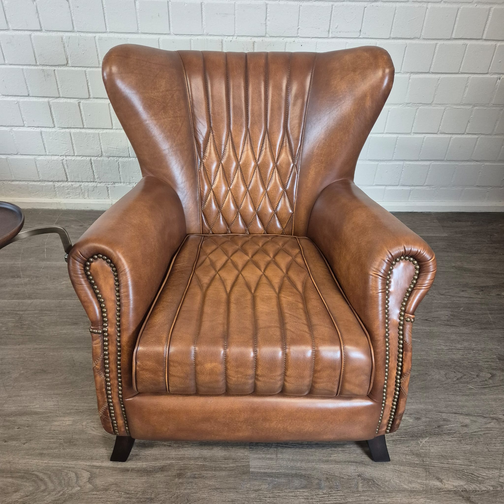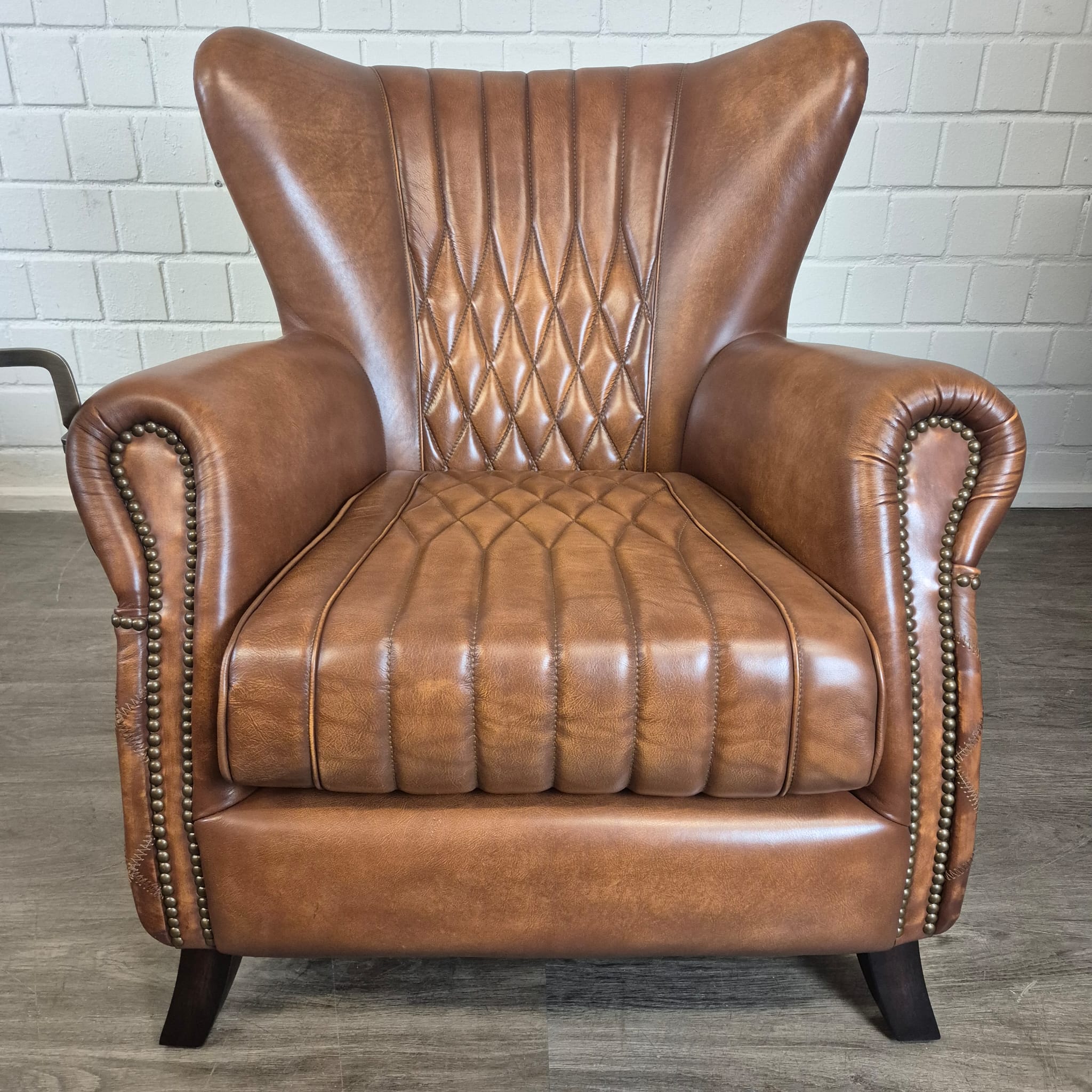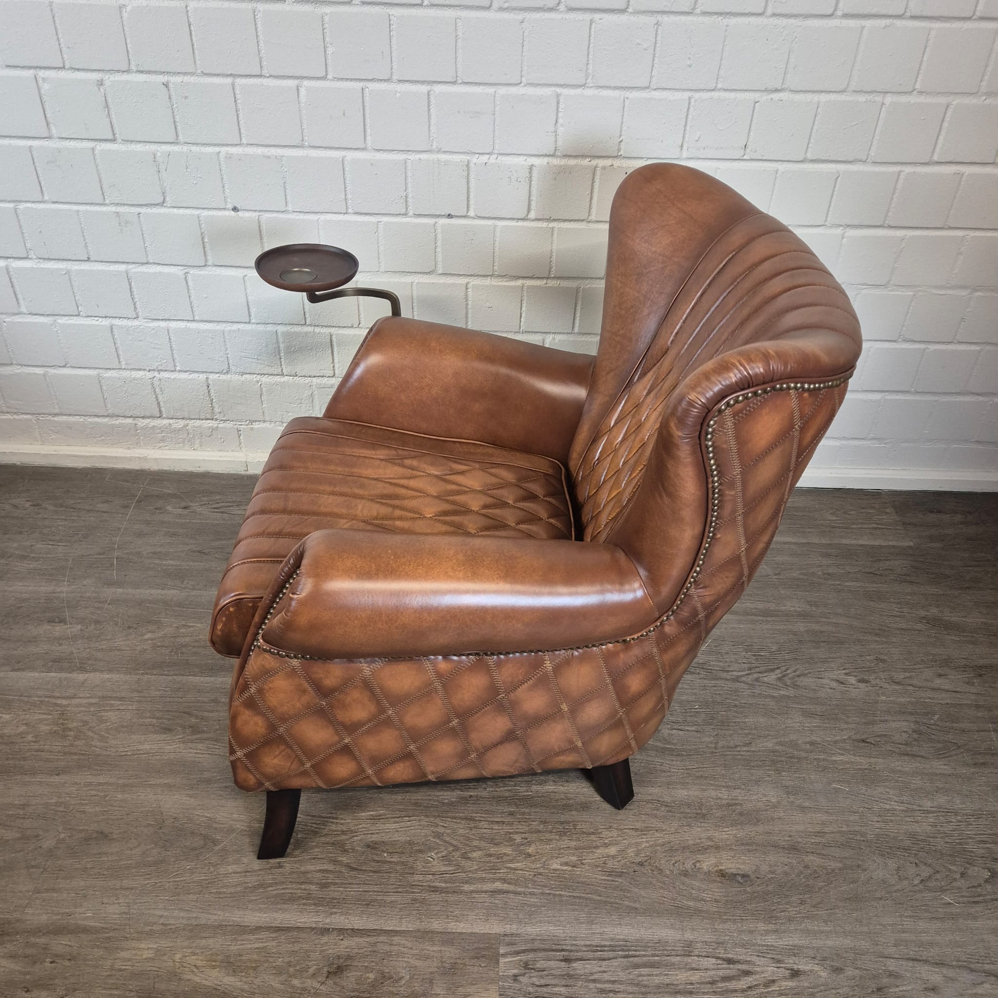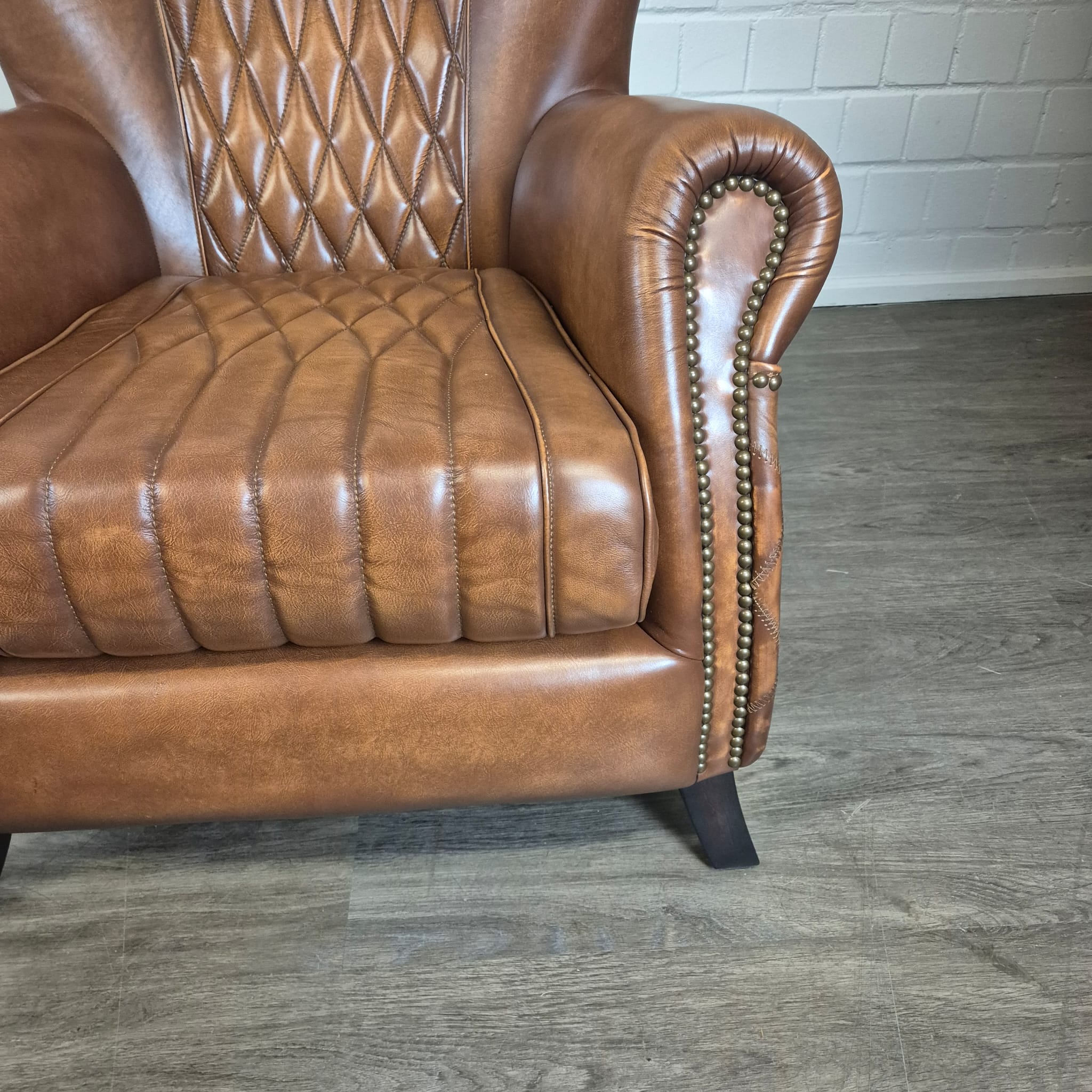 Deze fauteuil maakt indruk met zijn klassieke design met ruitvormige stiksels op de rugleuning en zijkanten, en elegant gebogen armleuningen. Hij is vervaardigd van hoogwaardig, echt leer dat er niet alleen luxueus uitziet, maar ook ongelooflijk zacht en soepel aanvoelt. Het leer is zorgvuldig afgewerkt en heeft een prachtige, natuurlijke patina ontwikkeld, wat de fauteuil karakter en charme geeft. De stevige houten poten met een donkere beits zorgen voor stabiliteit en vormen een perfecte aanvulling op de klassieke look.