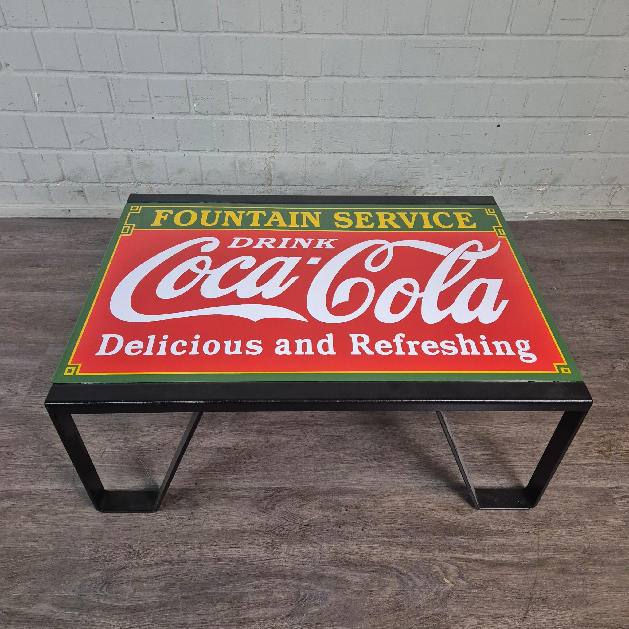 Authentiek Coca-Cola-ontwerp: het tafelblad is voorzien van een levendig en klassiek Coca-Cola-motief in vintage-stijl met de woorden "Fountain Service", het beroemde "Coca-Cola"-logo en de slogan "Delicious and Refreshing".