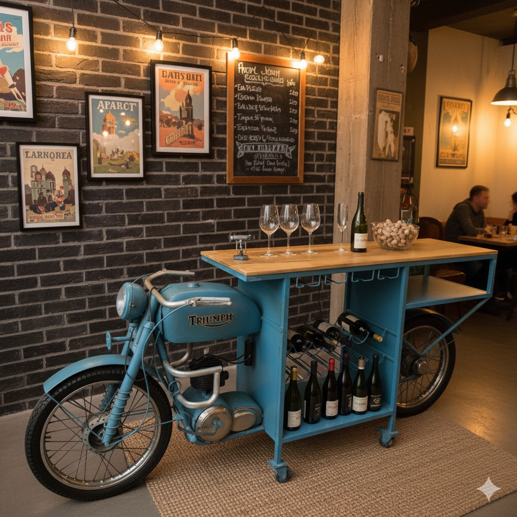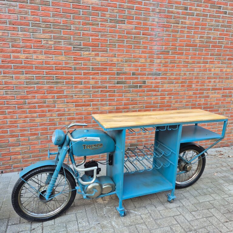 Deze uniek ontworpen minibar, gemaakt van originele scooteronderdelen, krijgt zijn bijzondere effect door de gebruikte materialen, die dit stuk een bijzonder karakter geven en uniek maken. De stijl en kleur van het metaal dragen in grote mate bij aan de visuele waarde van dit meubel, dat zowel decoratieve mogelijkheden als voldoende opbergruimte biedt.