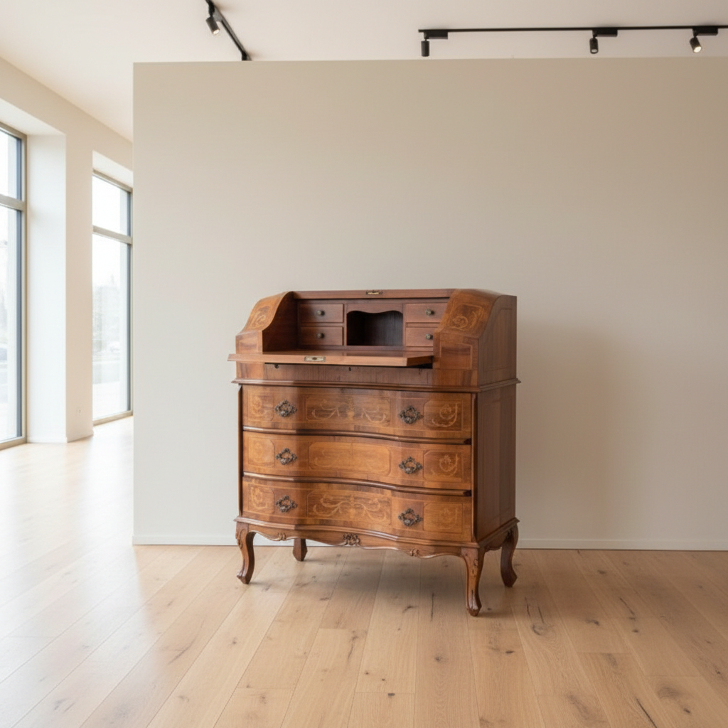 Stijlvolle neo-barok secretaire uit circa 1950, gefineerd in notenhout met inlegwerk en gewaxt. De kleine secretaire is in een zeer goede staat en heeft minimale gebruikssporen.