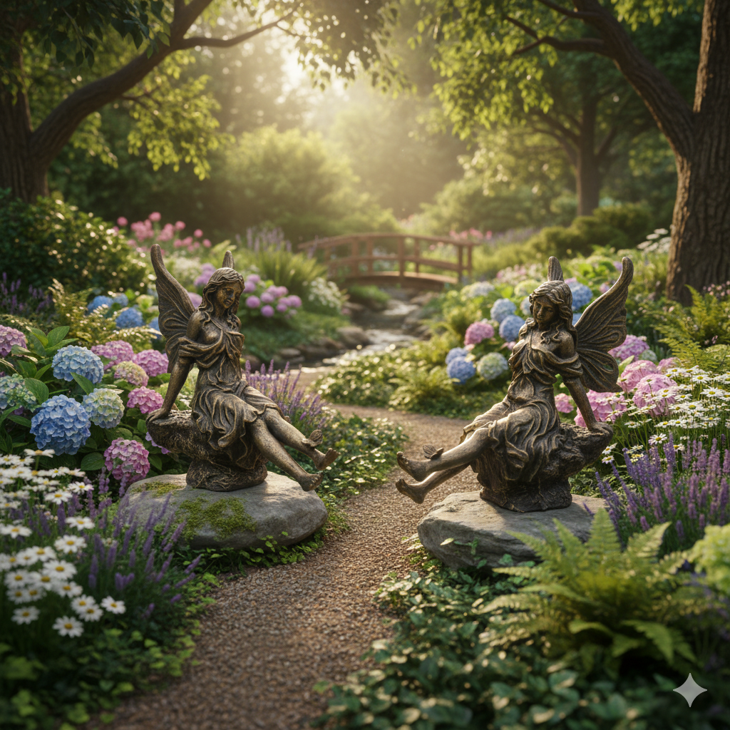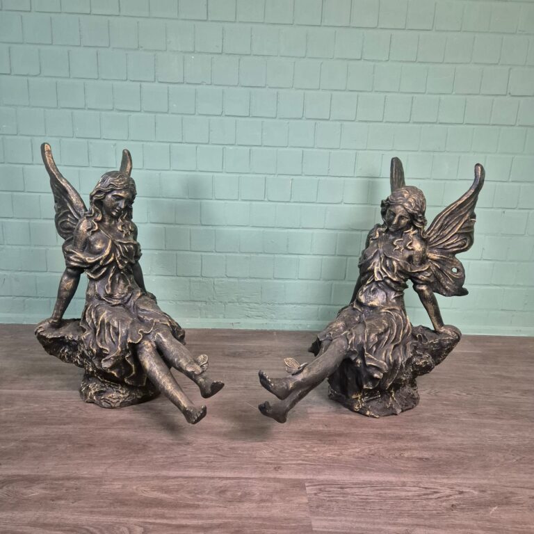 Voeg een vleugje magie toe aan uw tuin, terras of een bijzondere plek in huis met deze betoverende bronzen elfenfiguren. Deze sculpturen vangen een moment van magische rust en gratie, ideaal voor wie houdt van fantasie en minutieus detail.