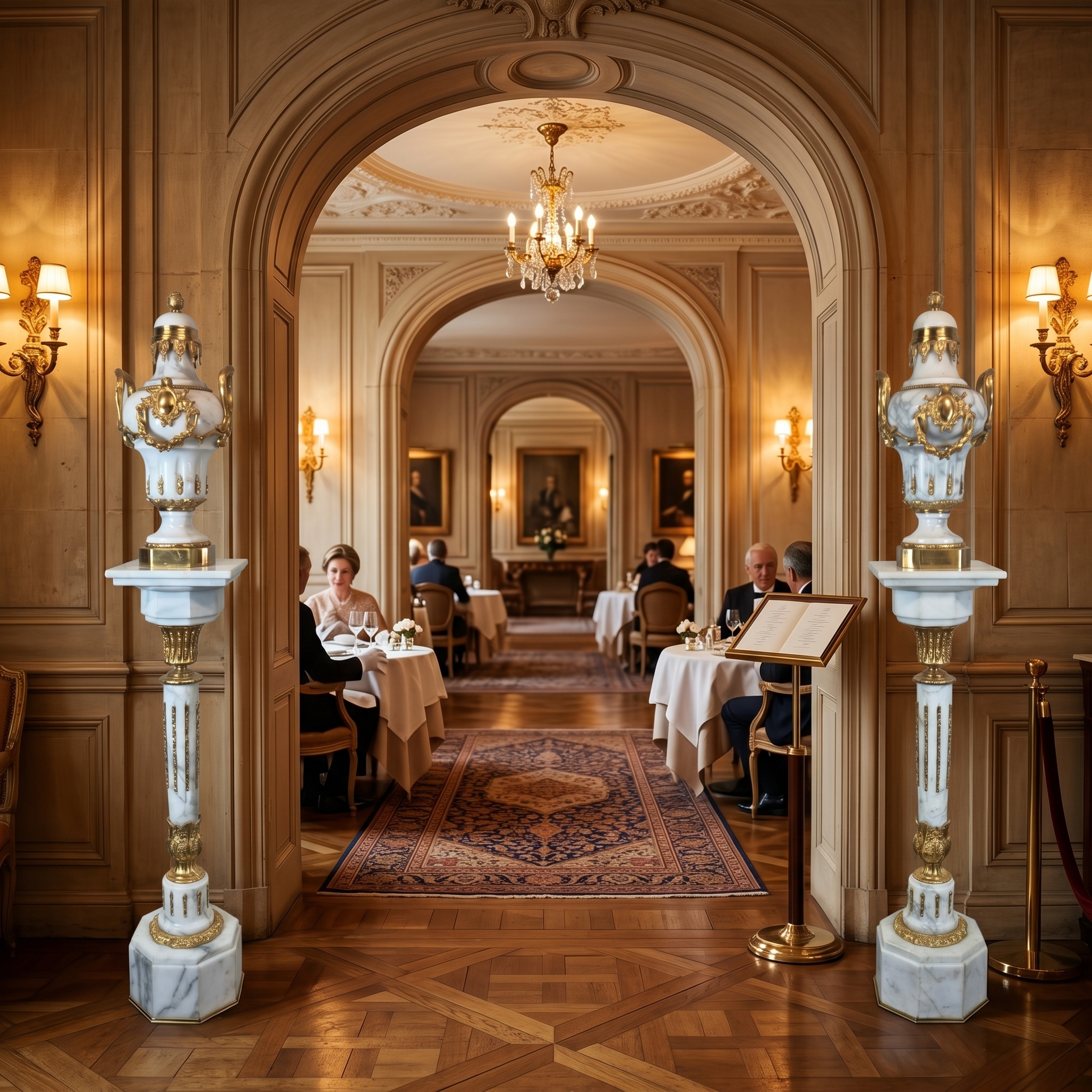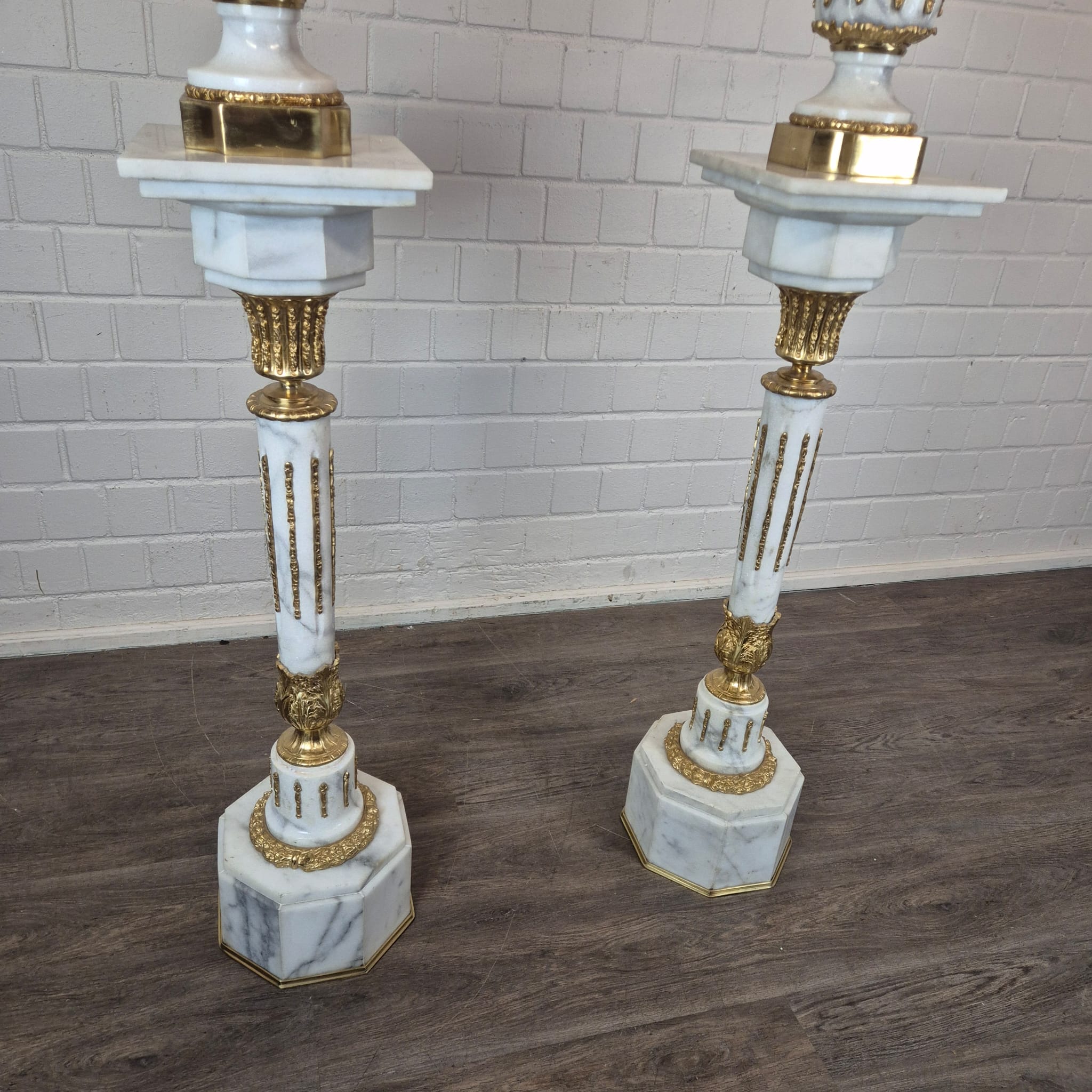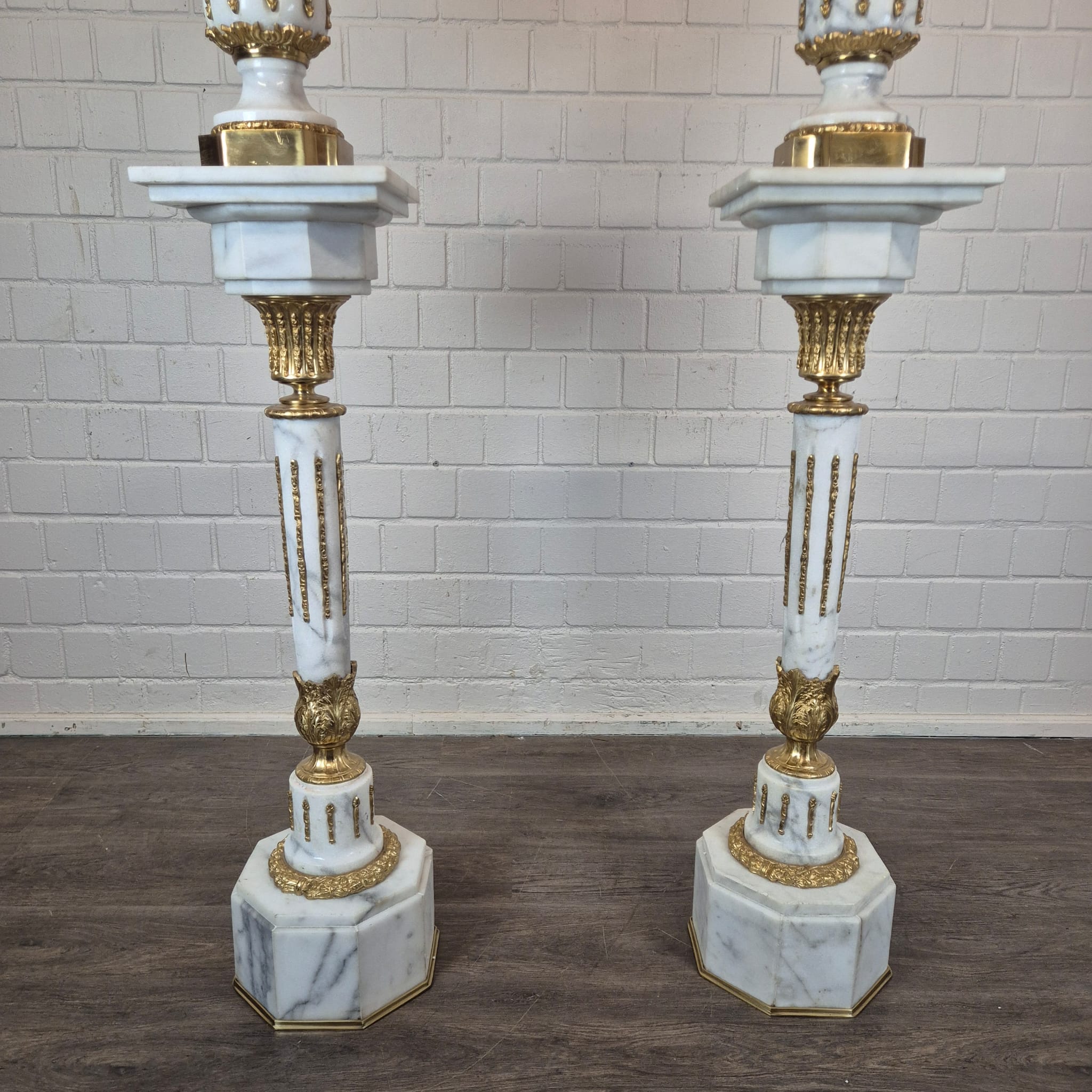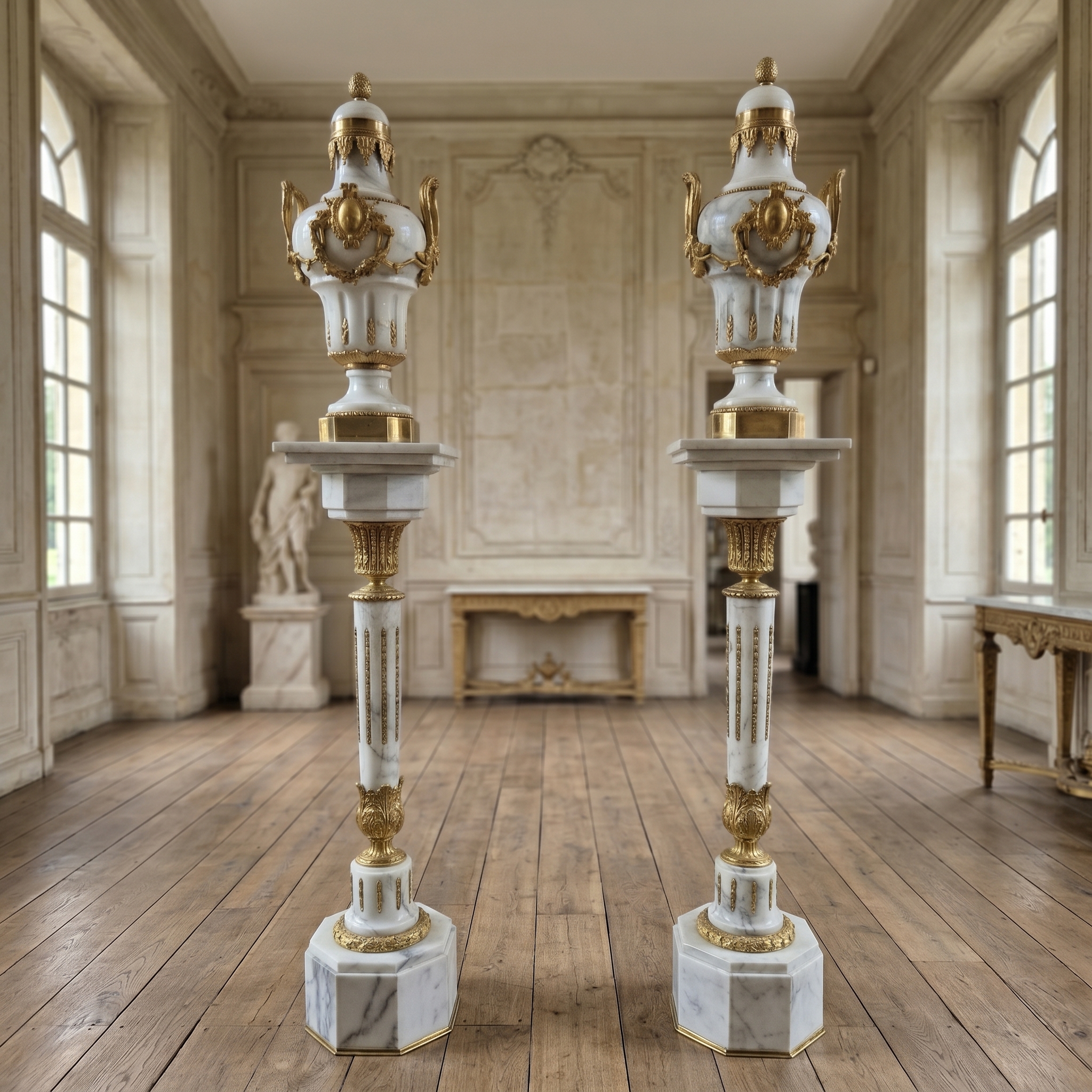 Dit paar betovert met zijn prachtige combinatie van materialen: fijn geaderd wit marmer en rijk verguld bronzen beslag. Geïnspireerd door de weelderige stijl van het Franse Keizerrijk en Napoleon III, is dit ensemble een ware blikvanger van museumkwaliteit.