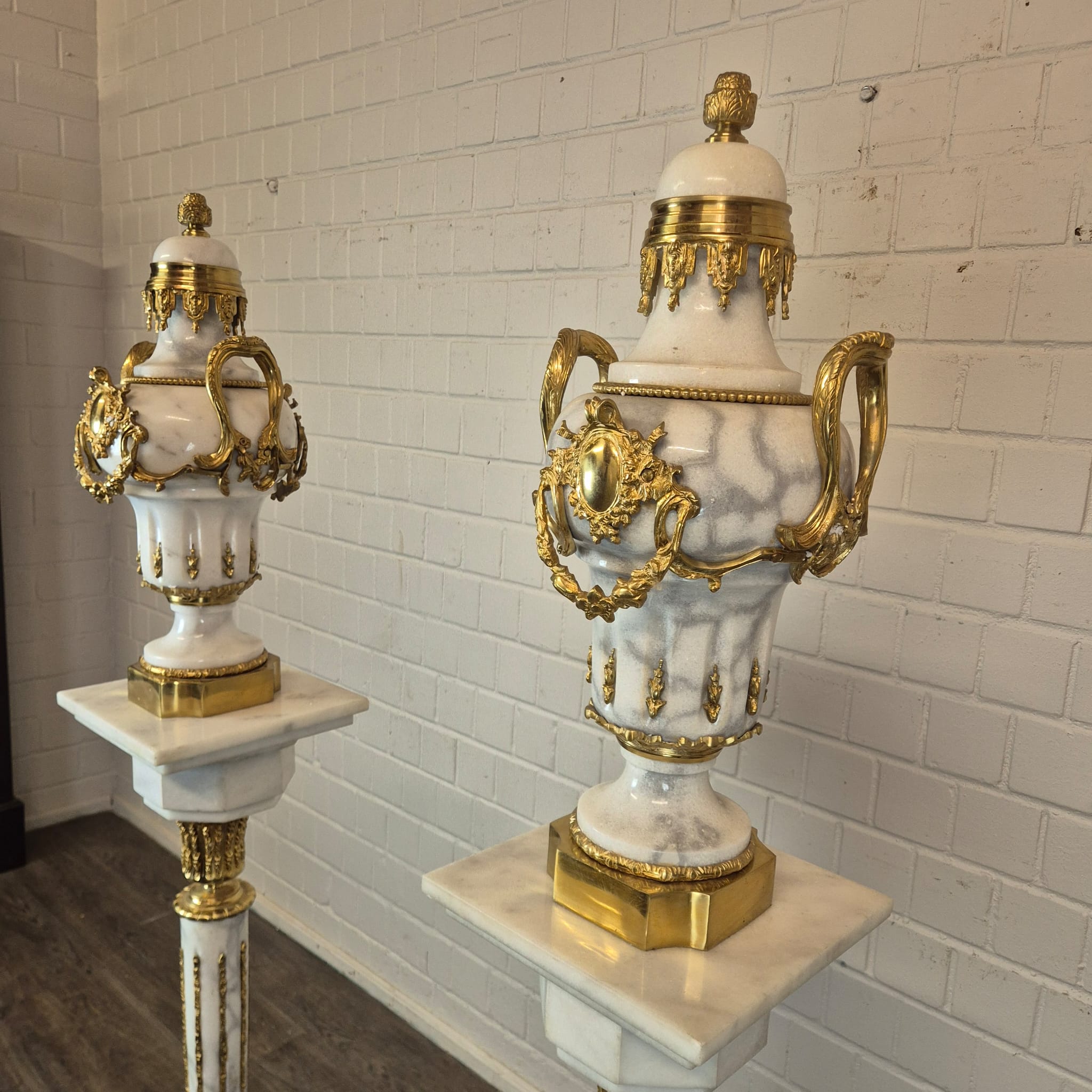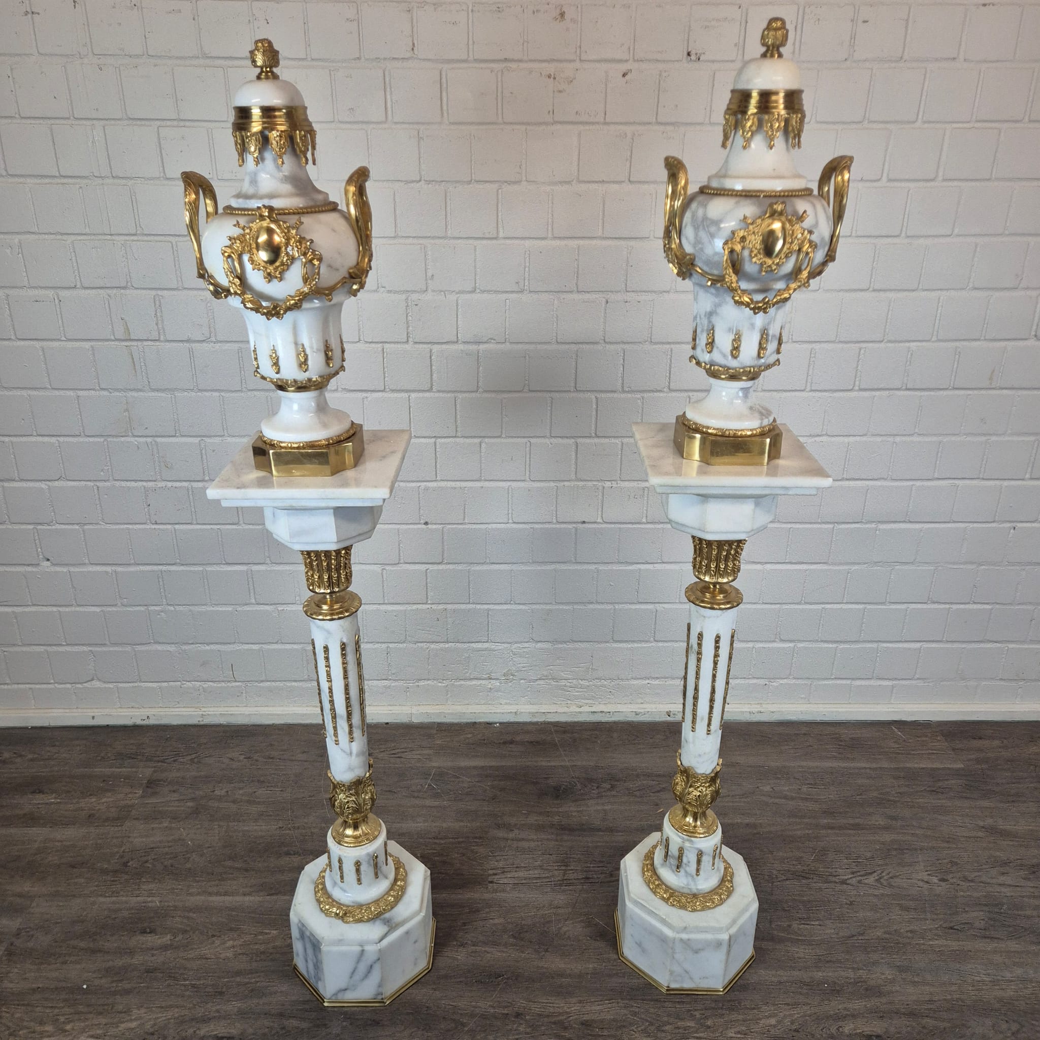 Verfraai uw huis, galerie of entree met een vleugje statige symmetrie en elegantie met dit buitengewone paar monumentale kunstobjecten. Te koop aangeboden is een set van twee identieke, indrukwekkende combinaties van fijn bewerkte siervazen en bijpassende zuilen.