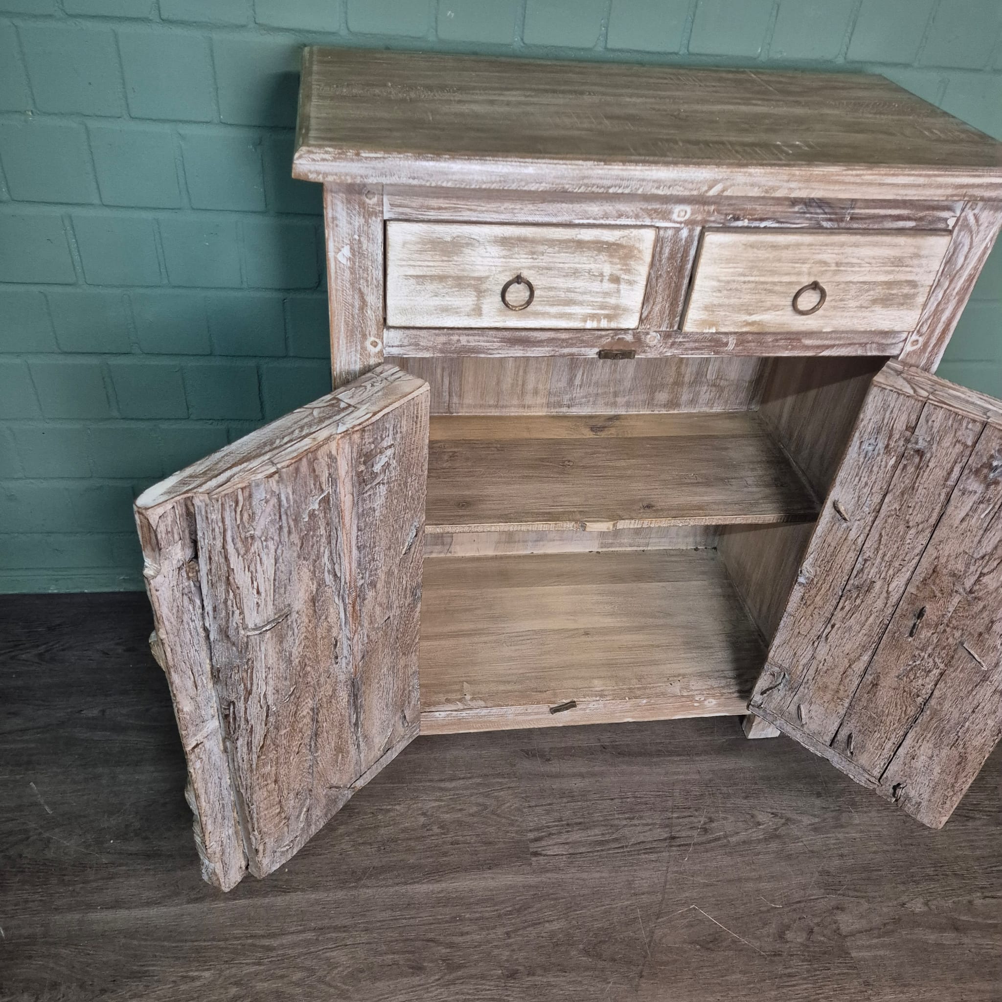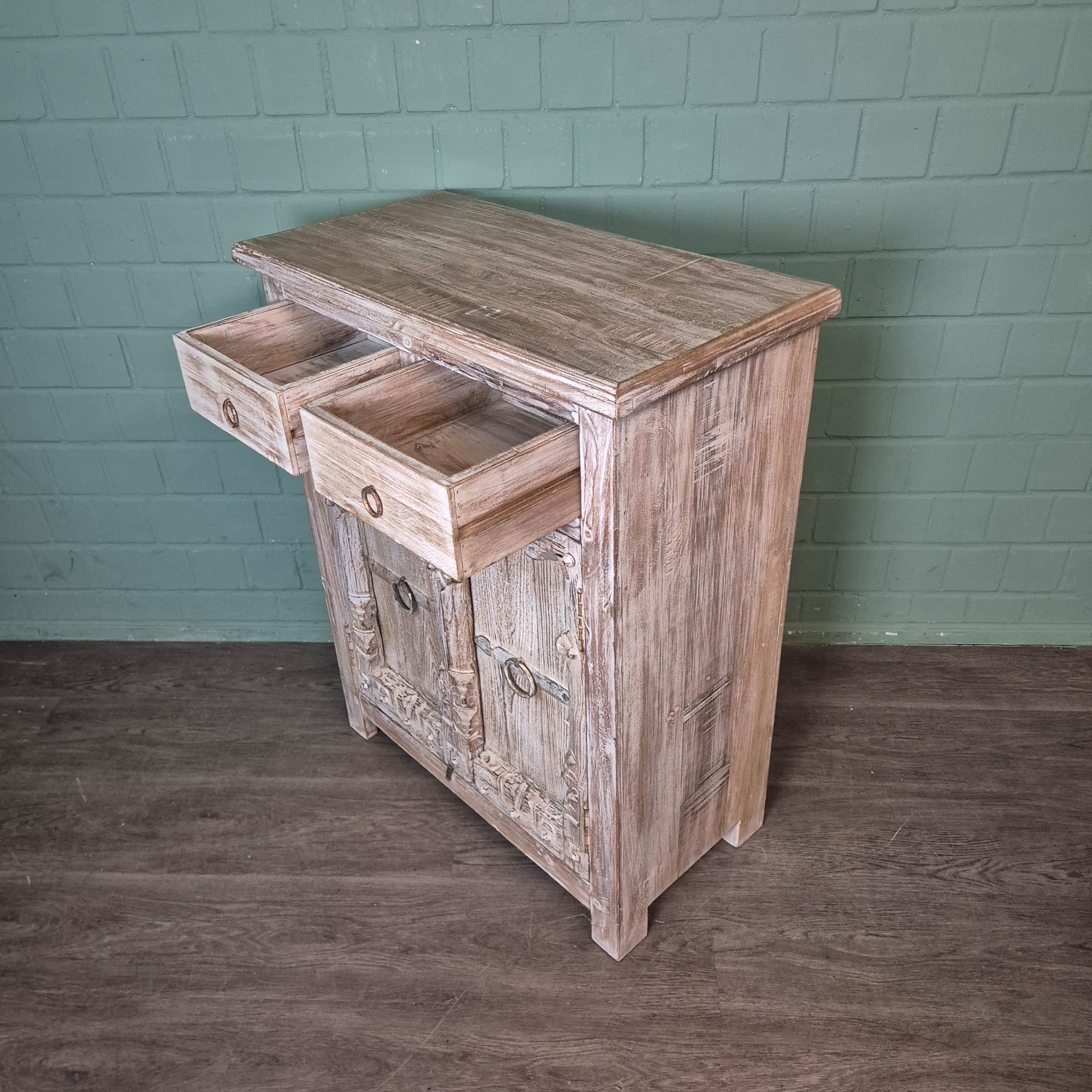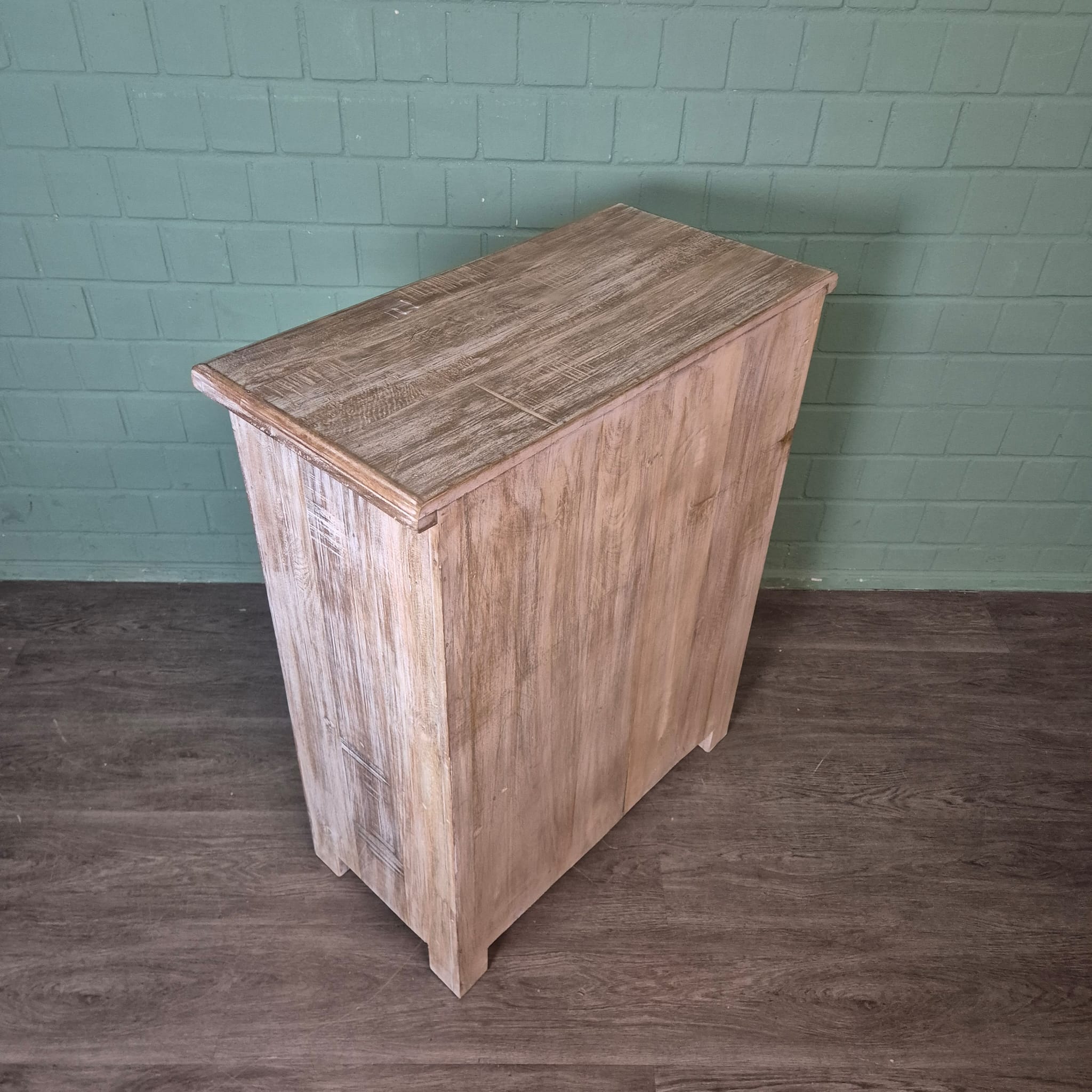 Dieses aufwendig gestaltete Sideboard aus Massivholz (Shabby-Chic Optik) erhält seine besondere Wirkung durch natürliche Unregelmäßigkeiten im Holz. Diese entstehen durch das verwendete Massivholz mit seinen verschiedenen Strukturen, welche diesem Stück einen eigentümlichen Charakter verleihen und es zu einem Unikat machen. Machart und Farbton des Holzes tragen sehr zum optischen Wert dieses Möbels bei, das sowohl dekorative Möglichkeiten als auch genügend Stauraum bietet.