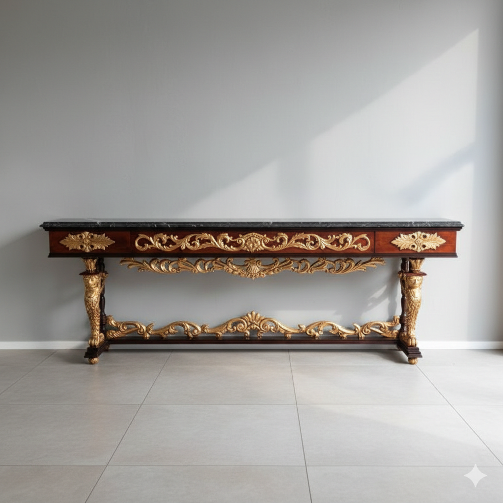 Stijlvolle sidetable in barokstijl gemaakt van mahonie (gelakt) met een marmeren blad. Demontabel (2-delig).