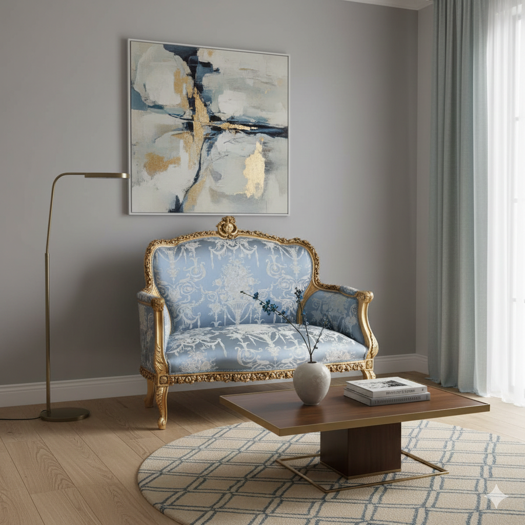 Bekleding: Hoogwaardige satijnen stof met een elegant bloemenpatroon in lichtblauw en wit/crème. De lichte glans van het satijn benadrukt het bloemenpatroon en geeft de bank een extra dimensie van luxe.