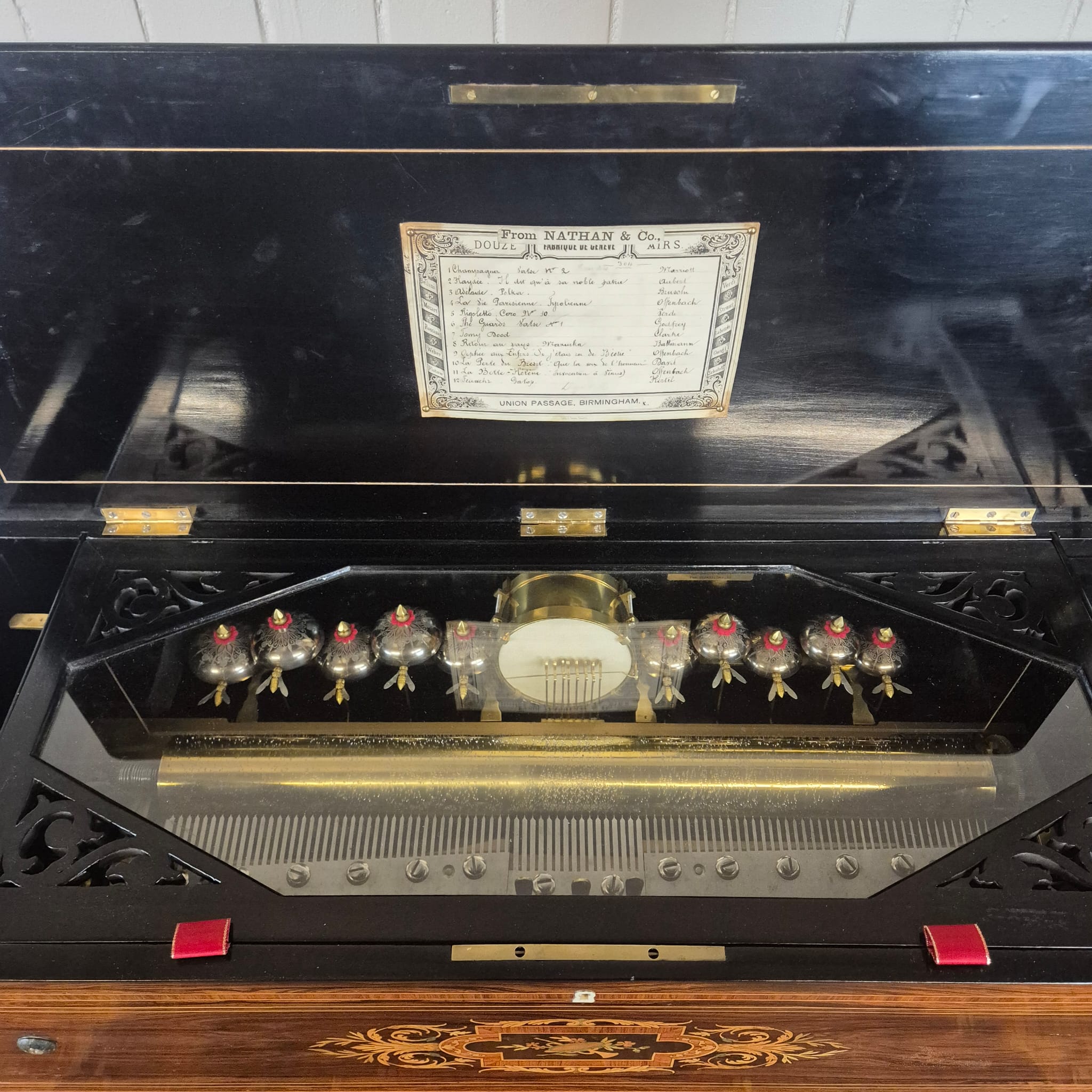 Muzikaal bereik: De extra brede messing cilinder speelt in totaal 12 verschillende melodieën (airs). Het originele, kalligrafisch versierde melodieblad in het deksel is bewaard gebleven en bevat stukken van beroemde componisten (waaronder Verdi, Bellini en Gounod).