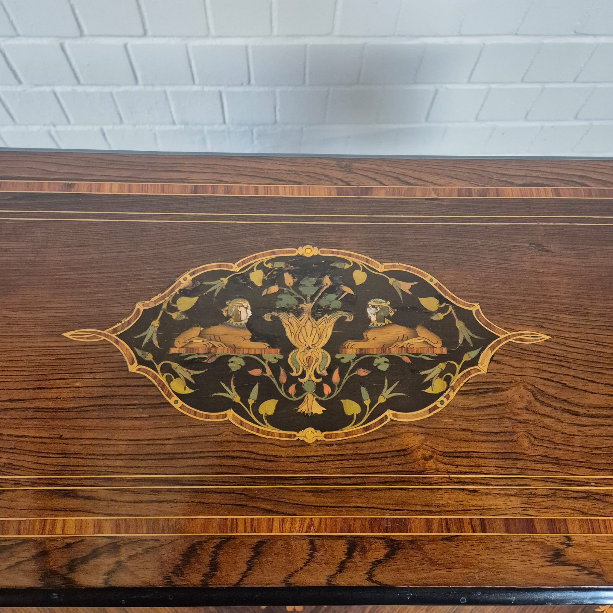 Kast: De kast is rijkelijk gefineerd met fijne houtsoorten (wortelhout/palissander) en is voorzien van delicate marqueterie (inlegwerk) op het deksel en de voorkant.