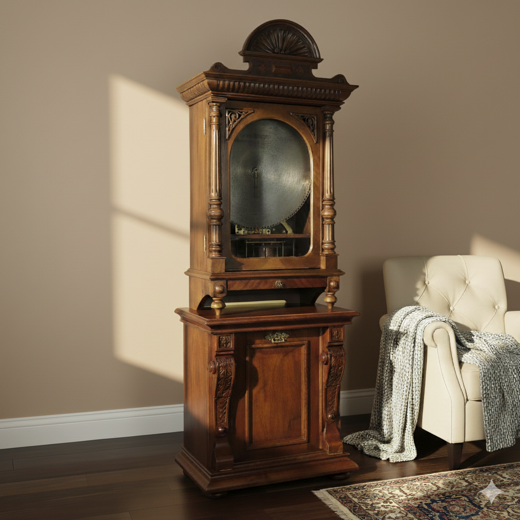 €8.749,00 Excl. btw:Originele staande Symphonion speeldoos. Gründerzeit, uit ca. 1880. De functionerende speeldoos verkeert in een zeer goede staat en vertoont slechts minimale gebruikssporen. De kast is gerestaureerd en gemaakt van gefineerd notenhout (gewaxt). De kast is vrij van houtworm en verkeert ook in een goede staat. Uitneembaar (2-delig).