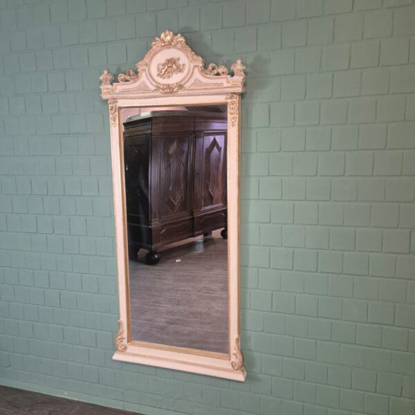Uitgebreid vormgegeven spiegel in barokstijl in de kleur antiek wit en goud.