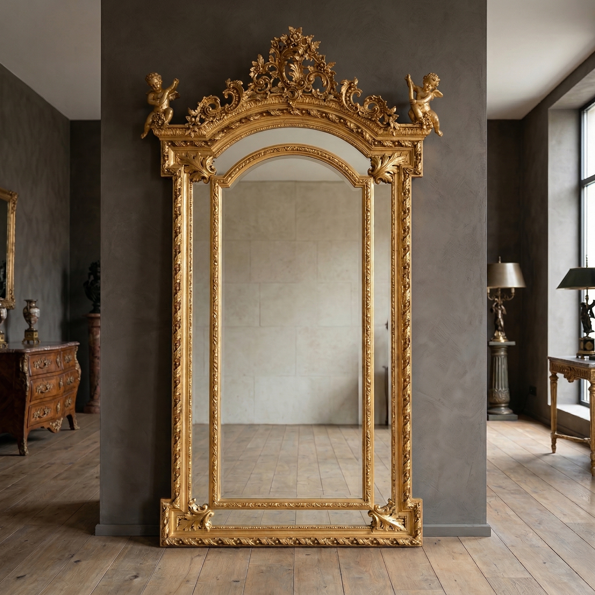 Deze prachtige spiegel in barokstijl is een waar meesterwerk van vakmanschap. Hij is nieuw vervaardigd en heeft een massief houten lijst, versierd met ingewikkeld houtsnijwerk en speelse details. Het gehele hout is prachtig goudkleurig afgewerkt, wat de spiegel een luxueuze en koninklijke uitstraling geeft. Het spiegelglas heeft een elegante afgeschuinde rand die het licht op een unieke manier breekt en extra diepte creëert. Met zijn imposante formaat en sierlijke versieringen in de vorm van twee cherubijnen is deze spiegel niet alleen een praktisch accessoire, maar ook een statement piece dat elke kamer een dramatische en glamoureuze touch geeft. Hij is de perfecte aanvulling op een stijlvolle woonkamer, weelderige hal of slaapkamer, waardoor elke ruimte groter en lichter lijkt.