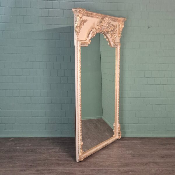 Materialen en ontwerp: De spiegel heeft een stevige massief houten lijst, vakkundig vervaardigd in barokstijl. Het gedetailleerde houtsnijwerk en de versieringen op de kroon van de spiegel, met bloemmotieven en gebogen lijnen, geven hem een luxueuze en verfijnde uitstraling. Het lichte, crèmewitte oppervlak met een lichte patina benadrukt het antieke karakter en geeft hem een bijzonder elegante uitstraling, terwijl hij naadloos past in diverse interieurstijlen – van klassiek barok tot modern chic als accentstuk.