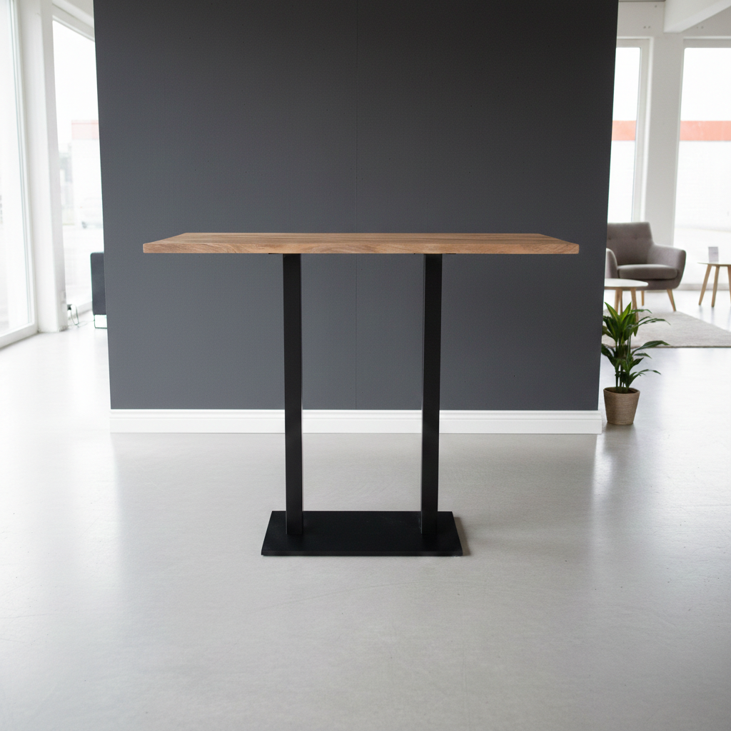 Deze veelzijdige tafel combineert de natuurlijke schoonheid van massief mangohout met de strakke lijnen van een zwart stalen frame in een moderne industriële stijl. Ideaal als robuuste bartafel of als duurzame bartafel in uw bedrijf.