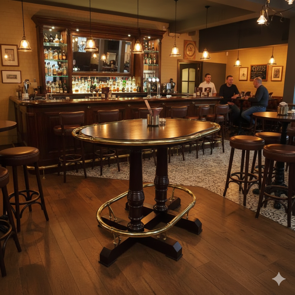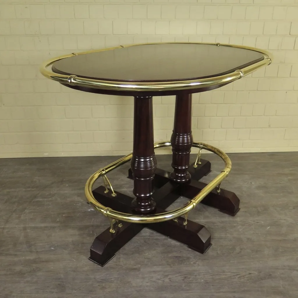 Klassieke bartafel gemaakt van massief mahonie met messing hand- en voetloop. Demontabel (2-delig).