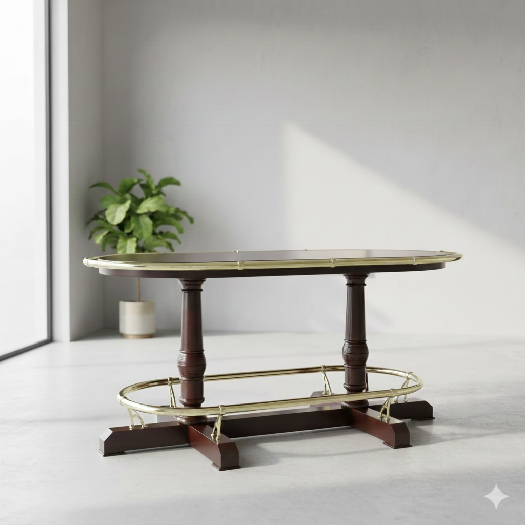 Klassieke bartafel gemaakt van massief mahonie met messing hand- en voetloop. Demontabel (2-delig).