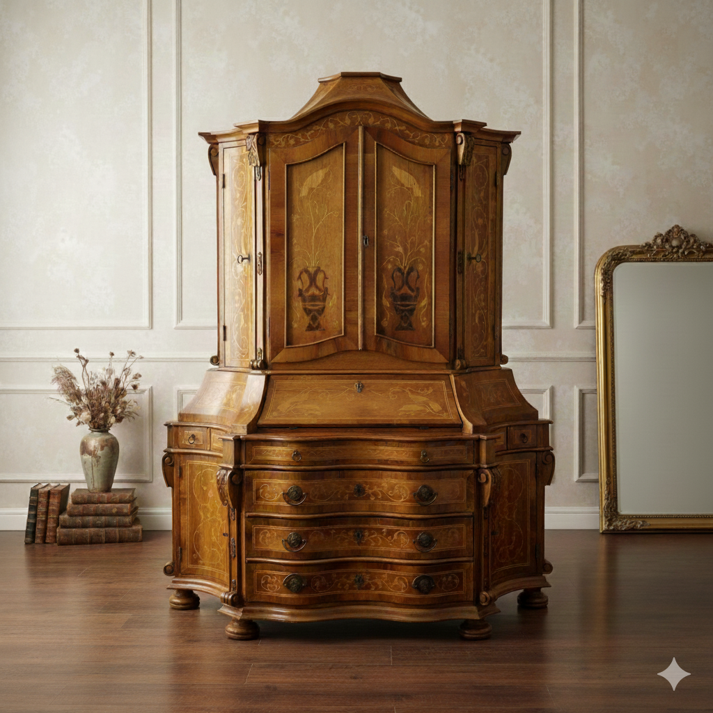 Gerestaureerde tabernakel secretaire, noten met intarsia in barokstijl. De tabernakel secretaire is in een goede staat en heeft normale gebruikssporen. Deelbaar, 3-delig.