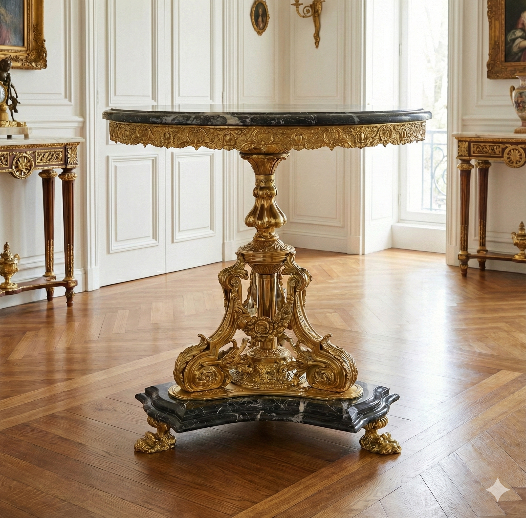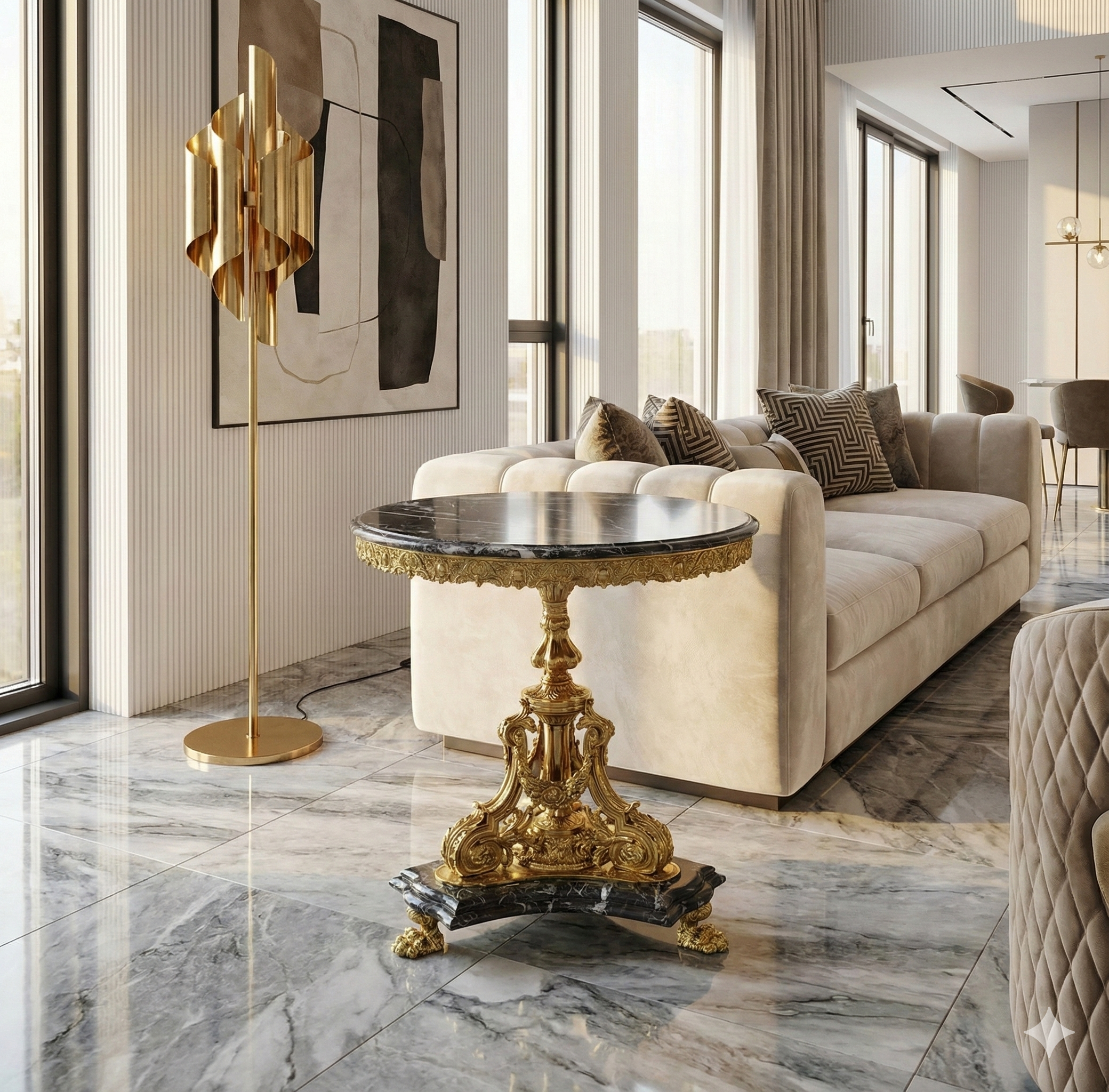 Stijlvol vormgegeven tafel van messing en marmer in baroklook.