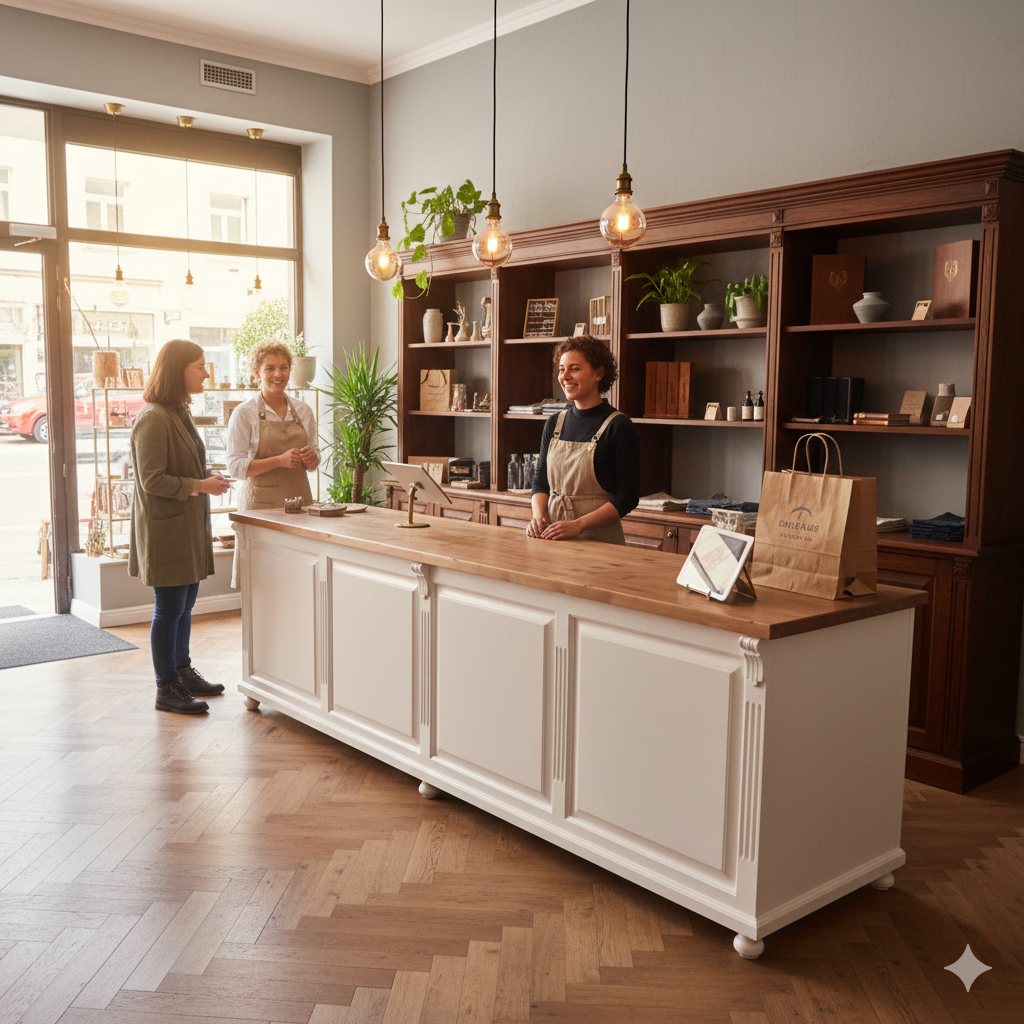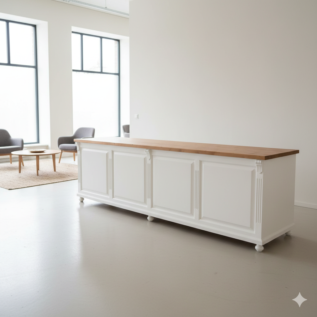 De toonbank gemaakt van massief hout overtuigt door zijn stijlvolle elegantie en hoogwaardige afwerking. De combinatie van een nostalgische uitstraling en moderne functionaliteit is geschikt voor alle winkelinrichtingen en vele andere toepassingen. De balie wordt compleet gemonteerd geleverd en is dus direct klaar voor gebruik. Op aanvraag kan de balie worden voorzien van lades en/of legplanken.De Pia-verkoopbalie van massief hout overtuigt door zijn stijlvolle elegantie en hoogwaardige afwerking. De combinatie van een nostalgische uitstraling en moderne functionaliteit is geschikt voor alle winkelinrichtingen en vele andere toepassingen. De balie wordt compleet gemonteerd geleverd en is dus direct klaar voor gebruik. Op aanvraag kan de balie worden voorzien van lades en/of legplanken.