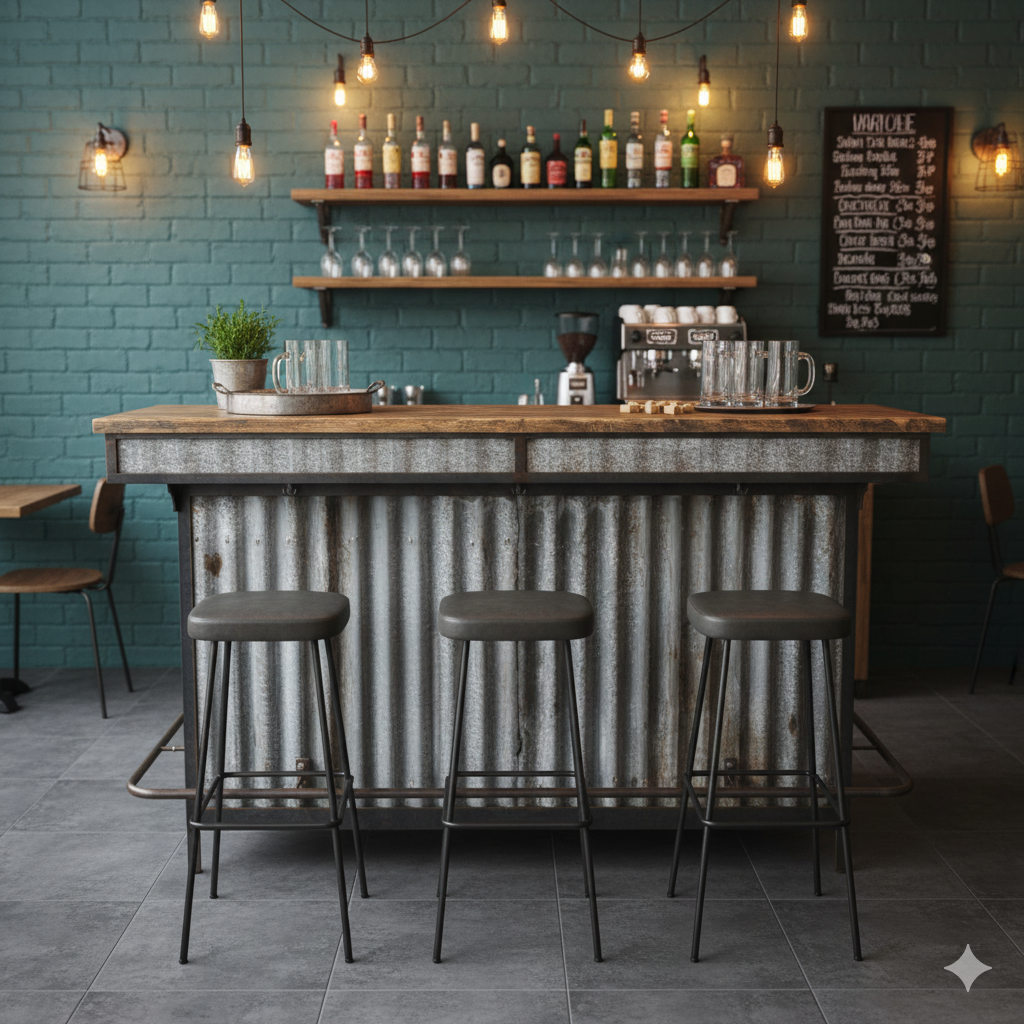 Het toonbankmodel Nino van massief teakhout (gerecycled) en golfplaten overtuigt door zijn uitgebreide afwerking en unieke uitstraling. De combinatie van industriële uitstraling en moderne functionaliteit is geschikt voor alle horecagelegenheden en vele andere toepassingsgebieden. De balie wordt compleet gemonteerd geleverd en is dus direct klaar voor gebruik.