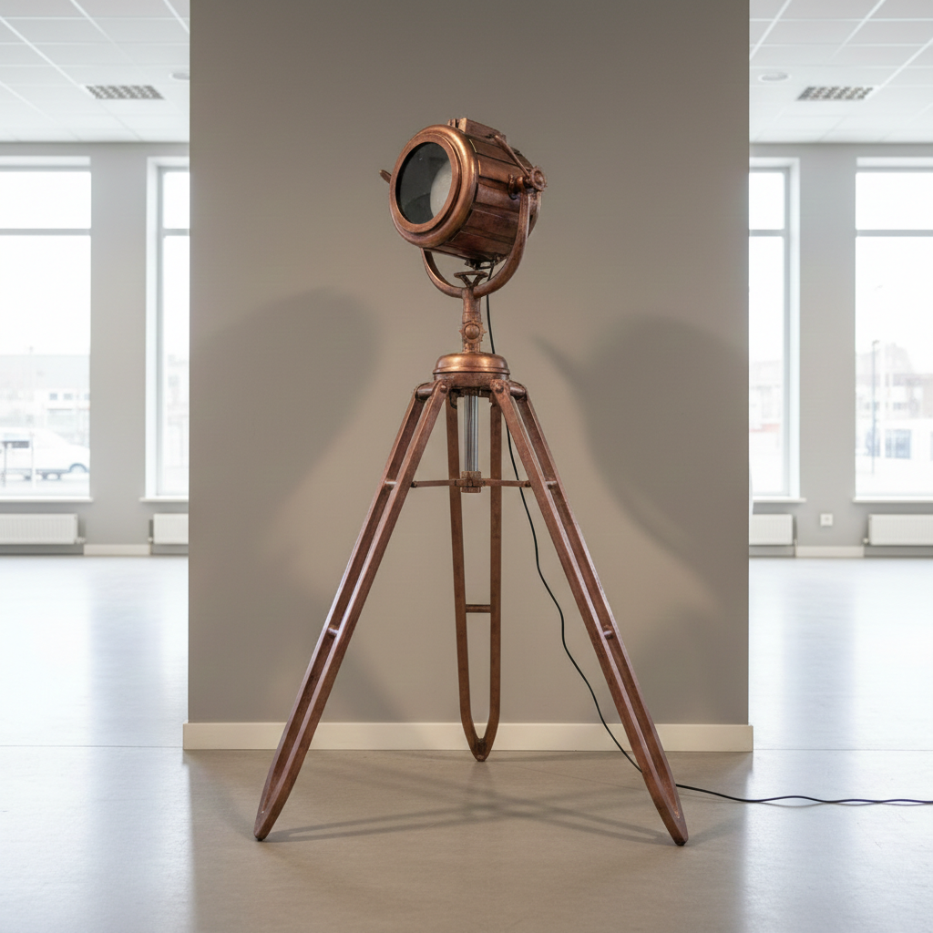 Tripod-Lamp gemaakt van metaal in koperkleur.