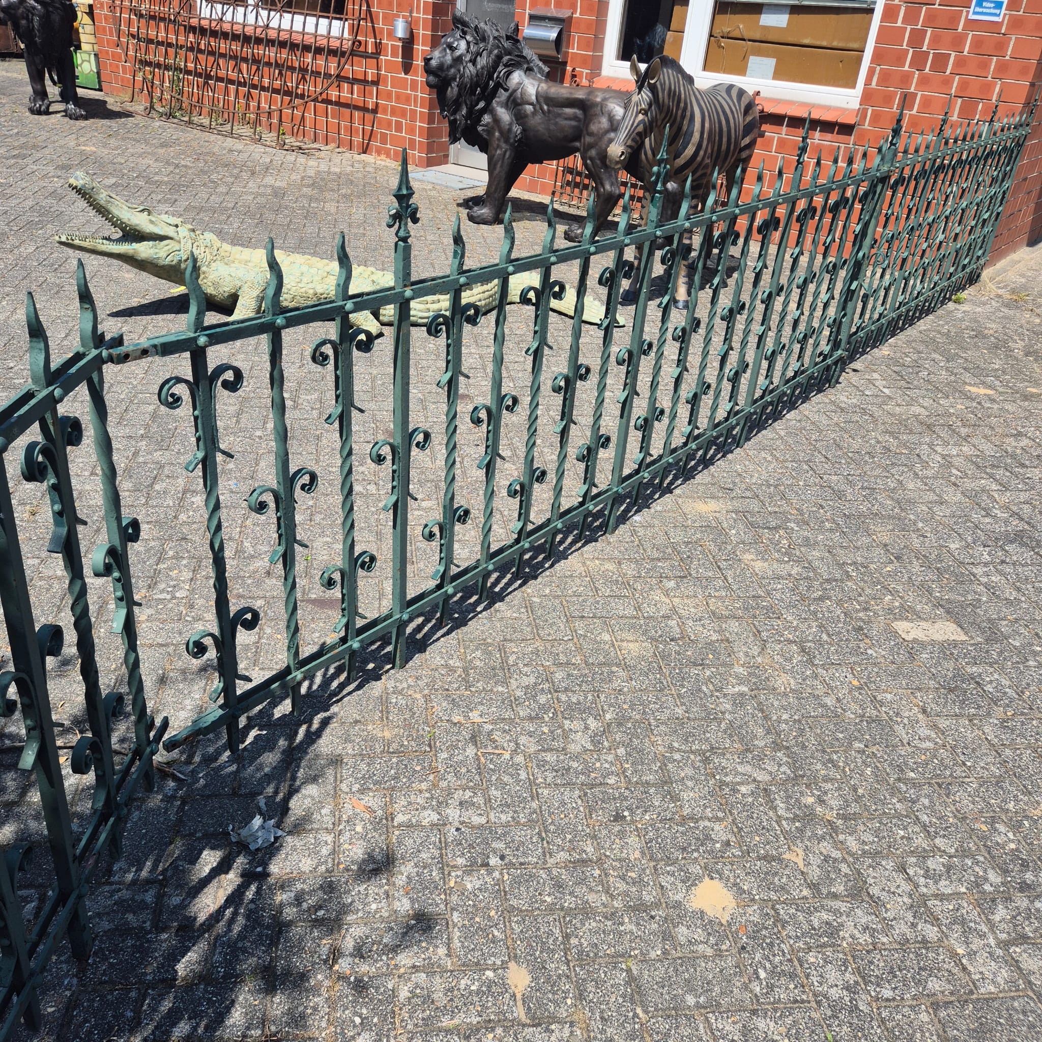 Antiek en gebruikt: Het hekwerk is gebruikt en antiek, wat het zijn authentieke charme geeft. Het patina dat zich in de loop van de decennia heeft ontwikkeld en eventuele kleine oneffenheden vertellen het verhaal en zorgen voor een unieke levendigheid. De groene kleur, die nog gedeeltelijk zichtbaar is, onderstreept het historische karakter.