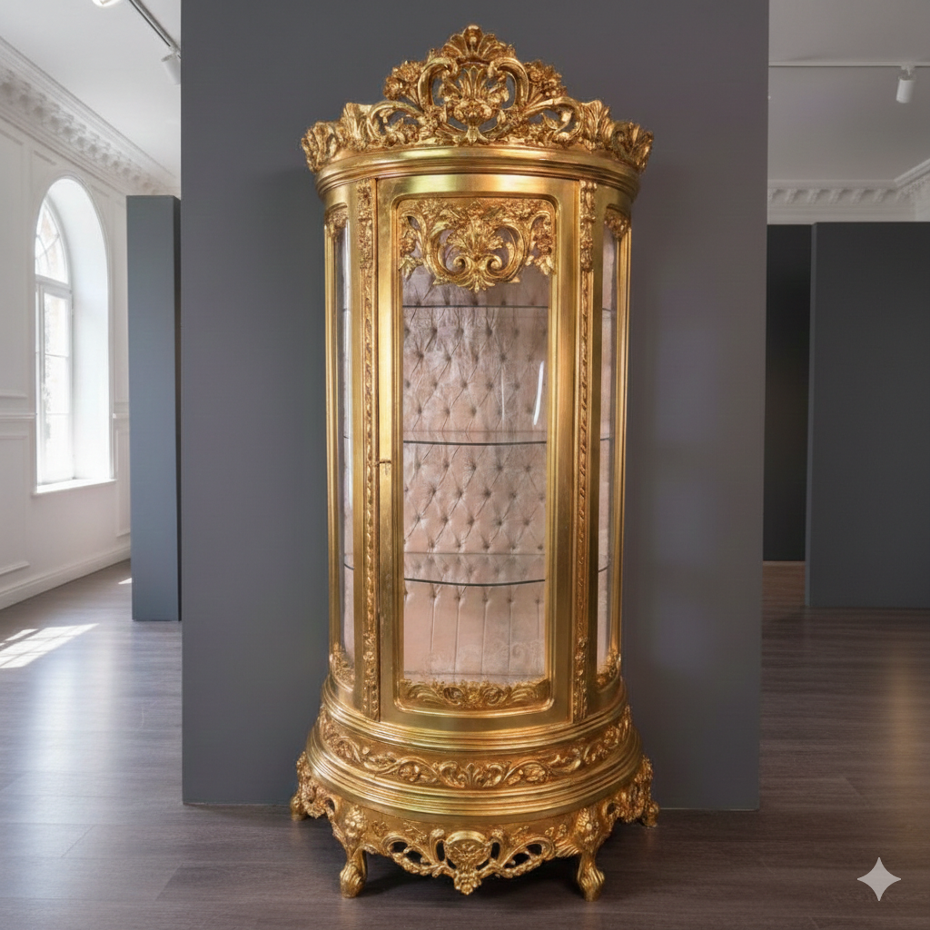 Geef uw kostbare verzamelobjecten, prachtig porselein of fijn glaswerk de perfecte setting met deze luxe vitrinekast. Dit magnifieke meubelstuk is niet alleen een opbergmogelijkheid, maar een kunstwerk op zich dat elke kamer vult met koninklijke pracht en elegantie.