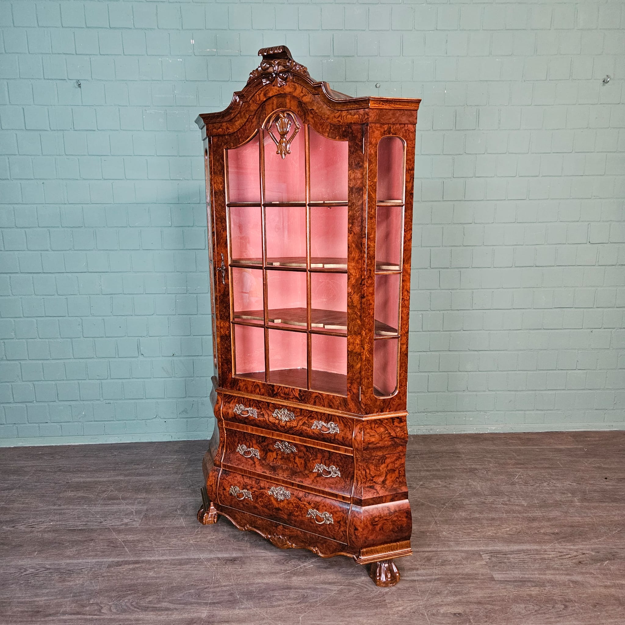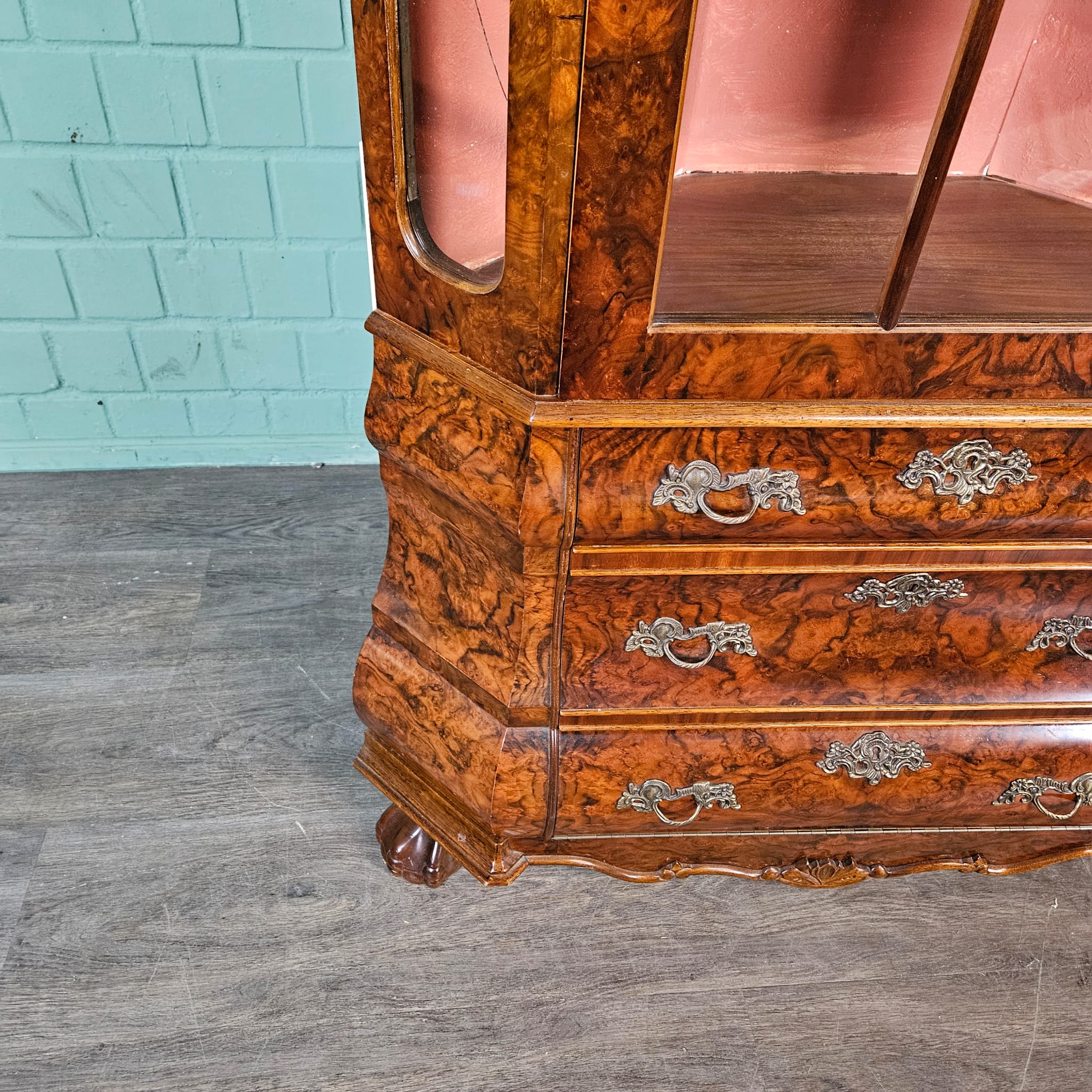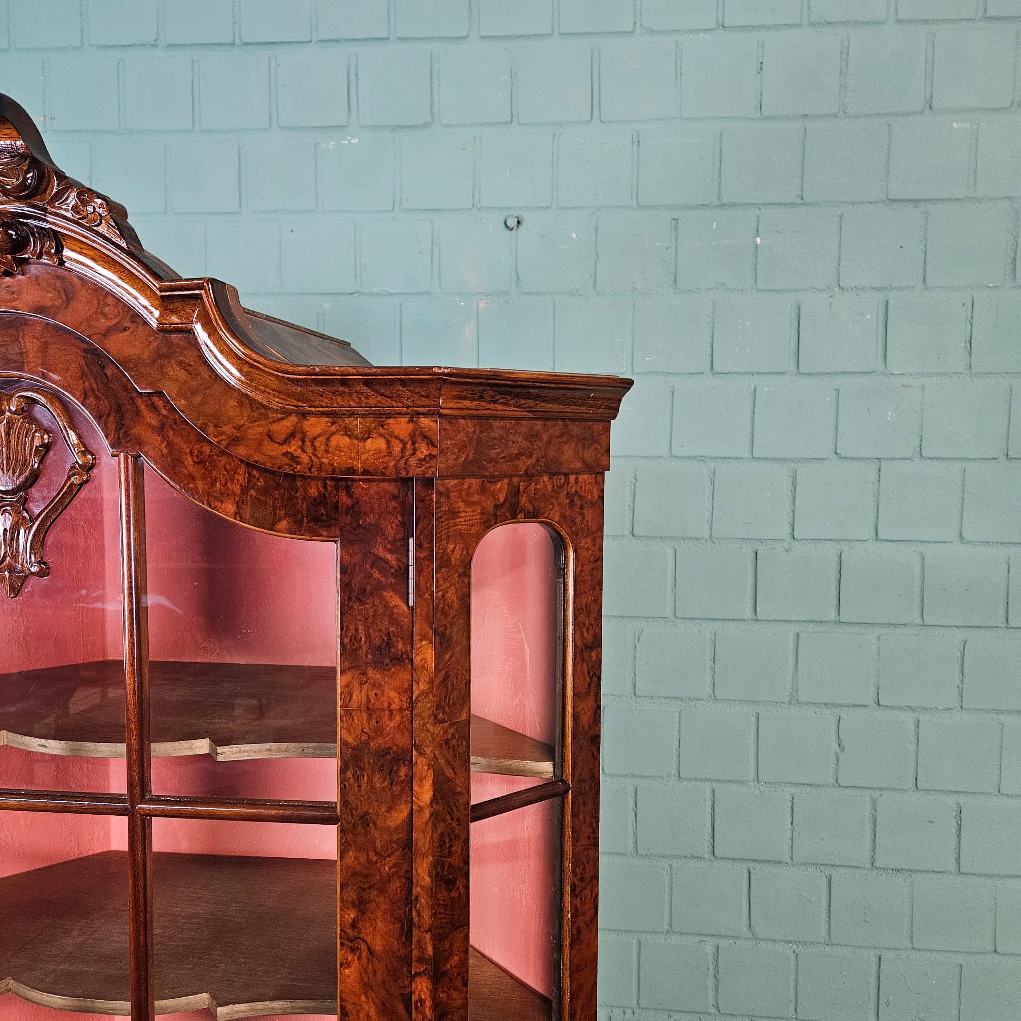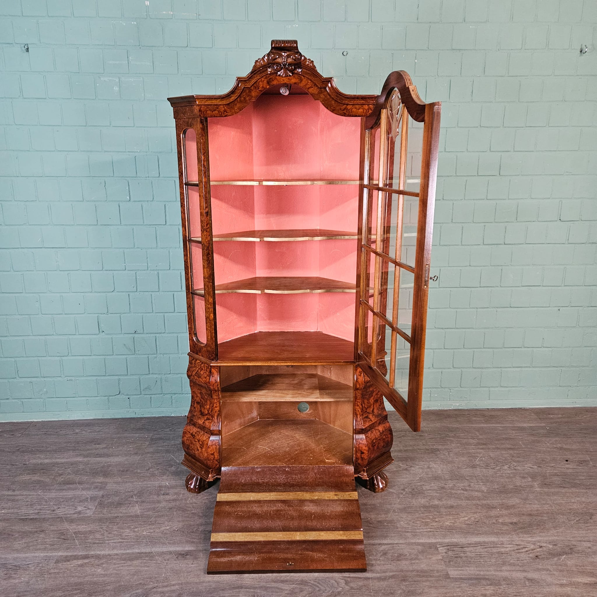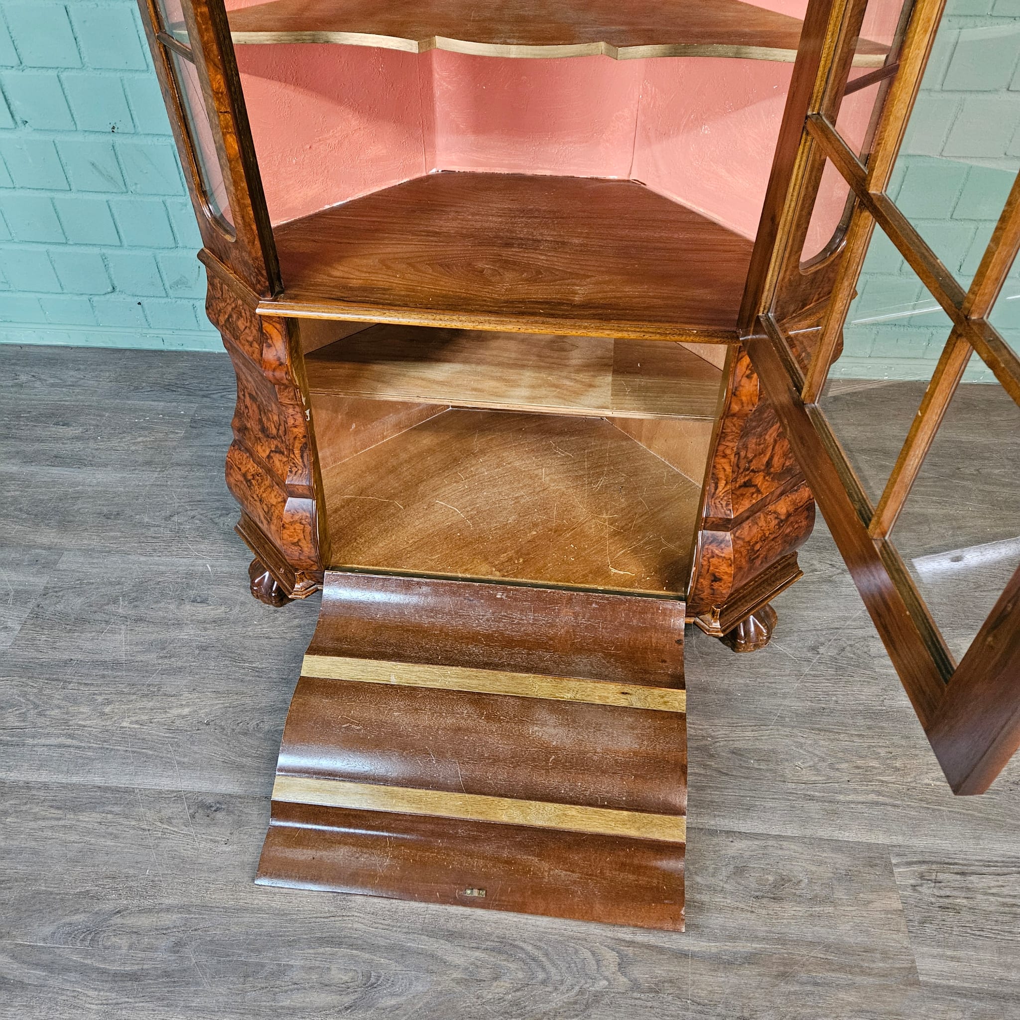 Gerestaureerde neo-barok hoekkast noten gefineerd. De hoekkast uit de jaren 30 is in een goede staat en heeft weinig gebruikssporen.