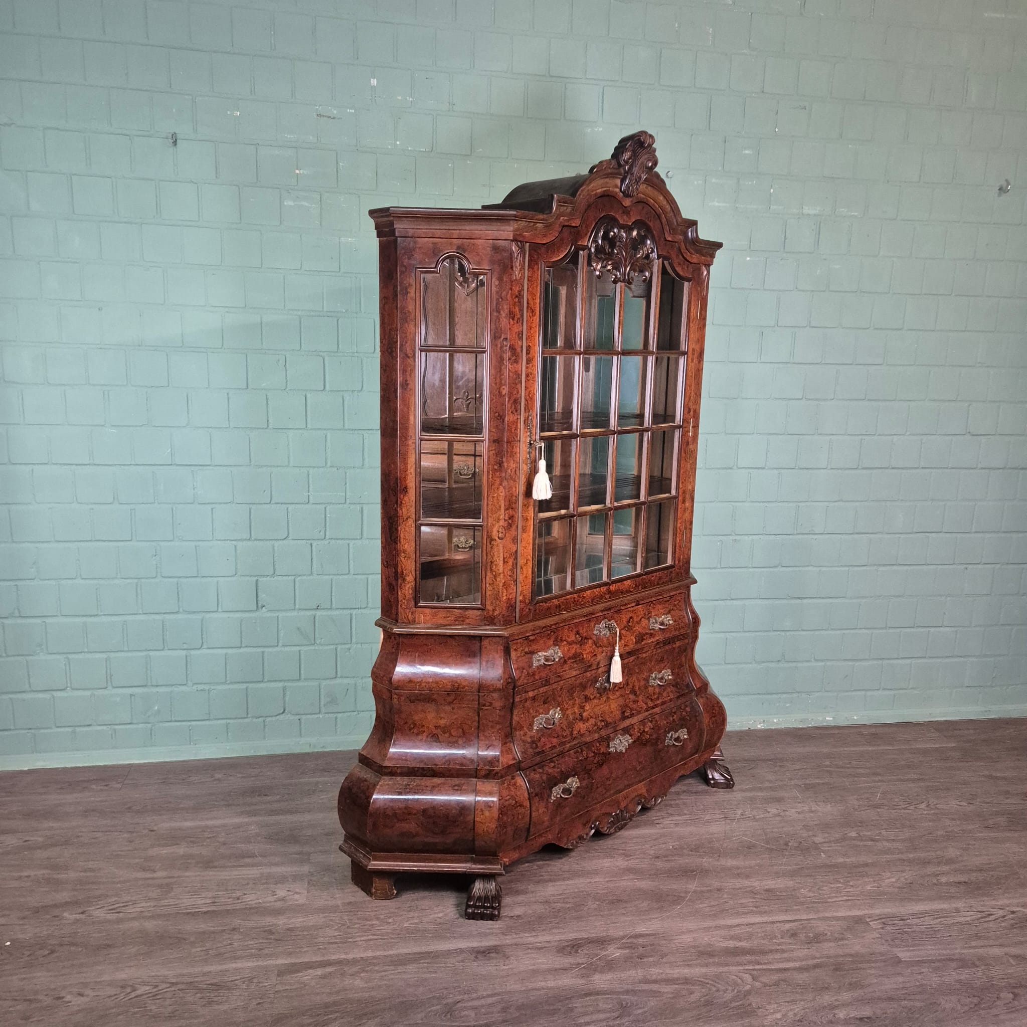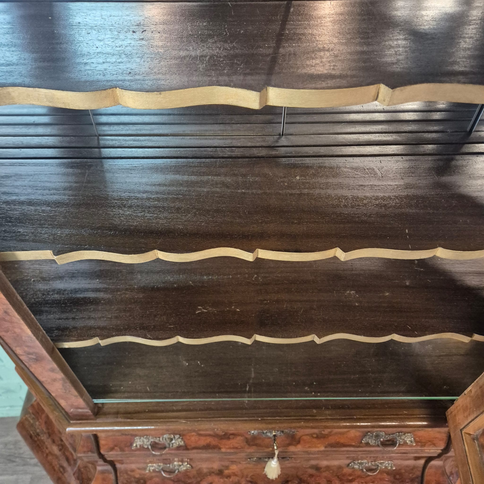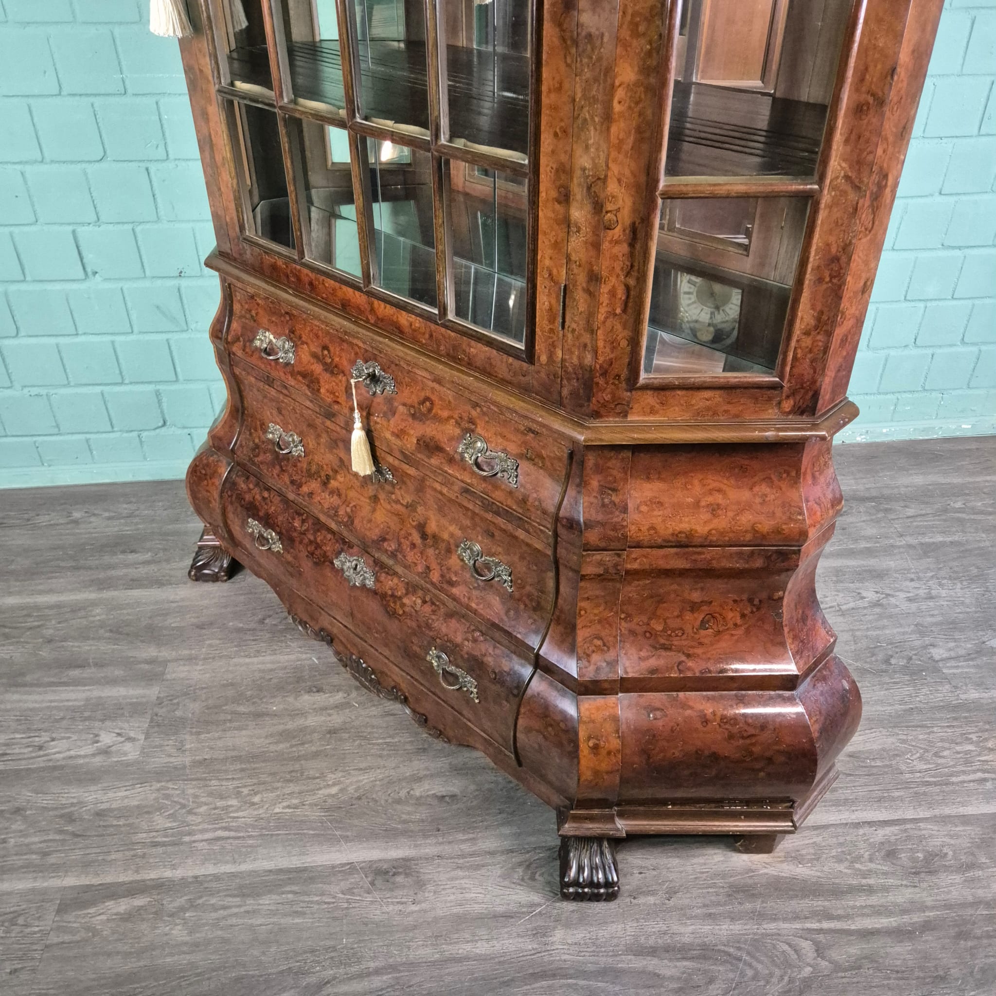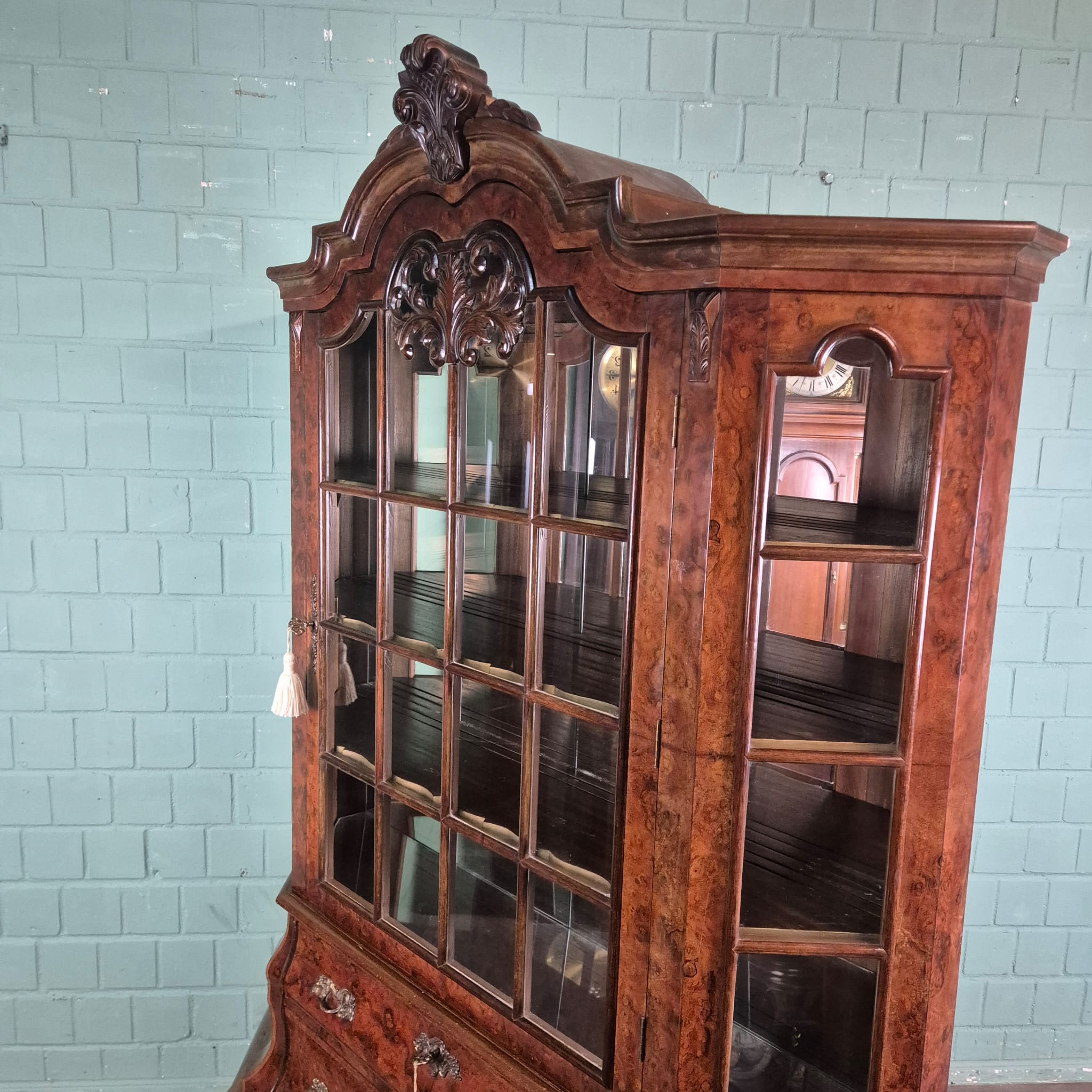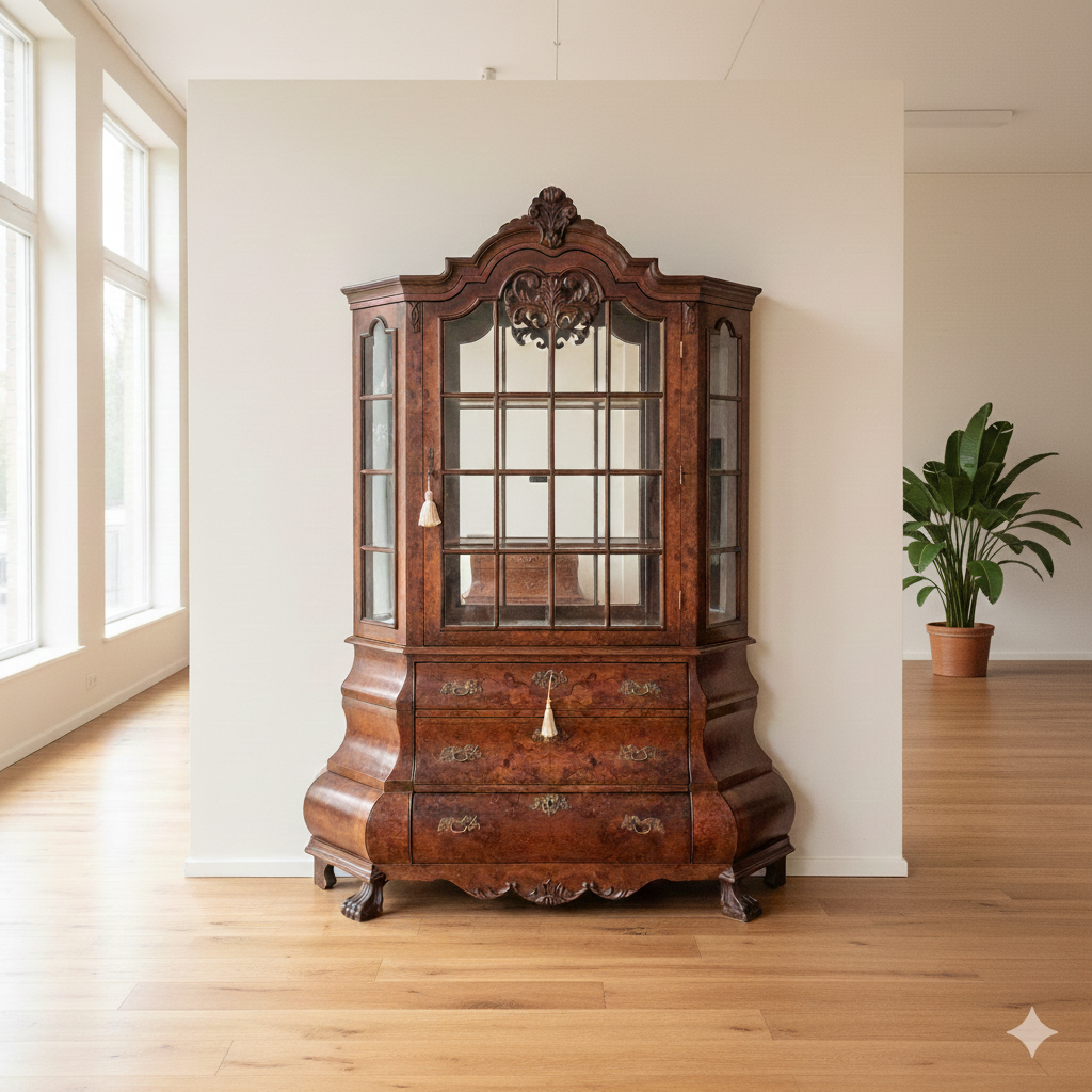 Stijlvolle neo-barok vitrine noten gefineerd en gelakt uit ca. 1970. De kast is in een goede staat en heeft lichte gebruikssporen. Demontabel (2-delig).