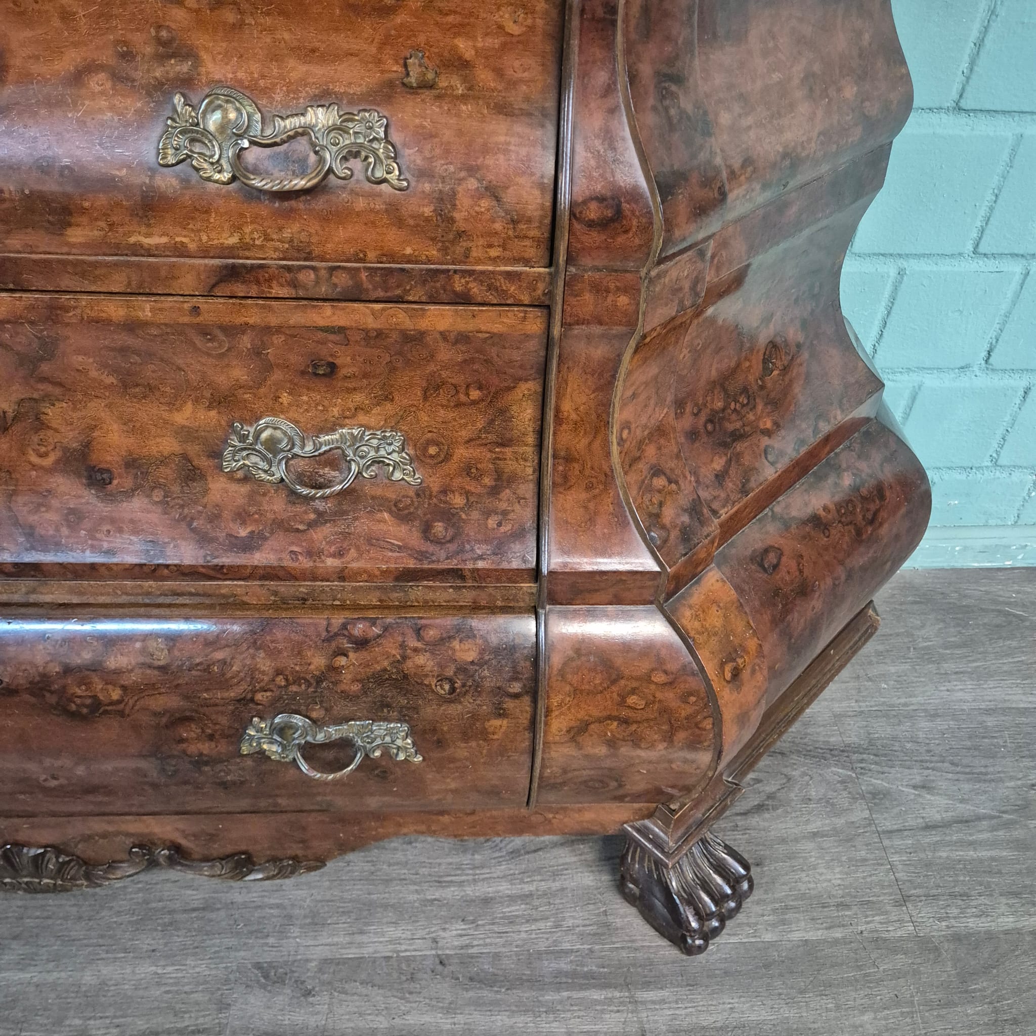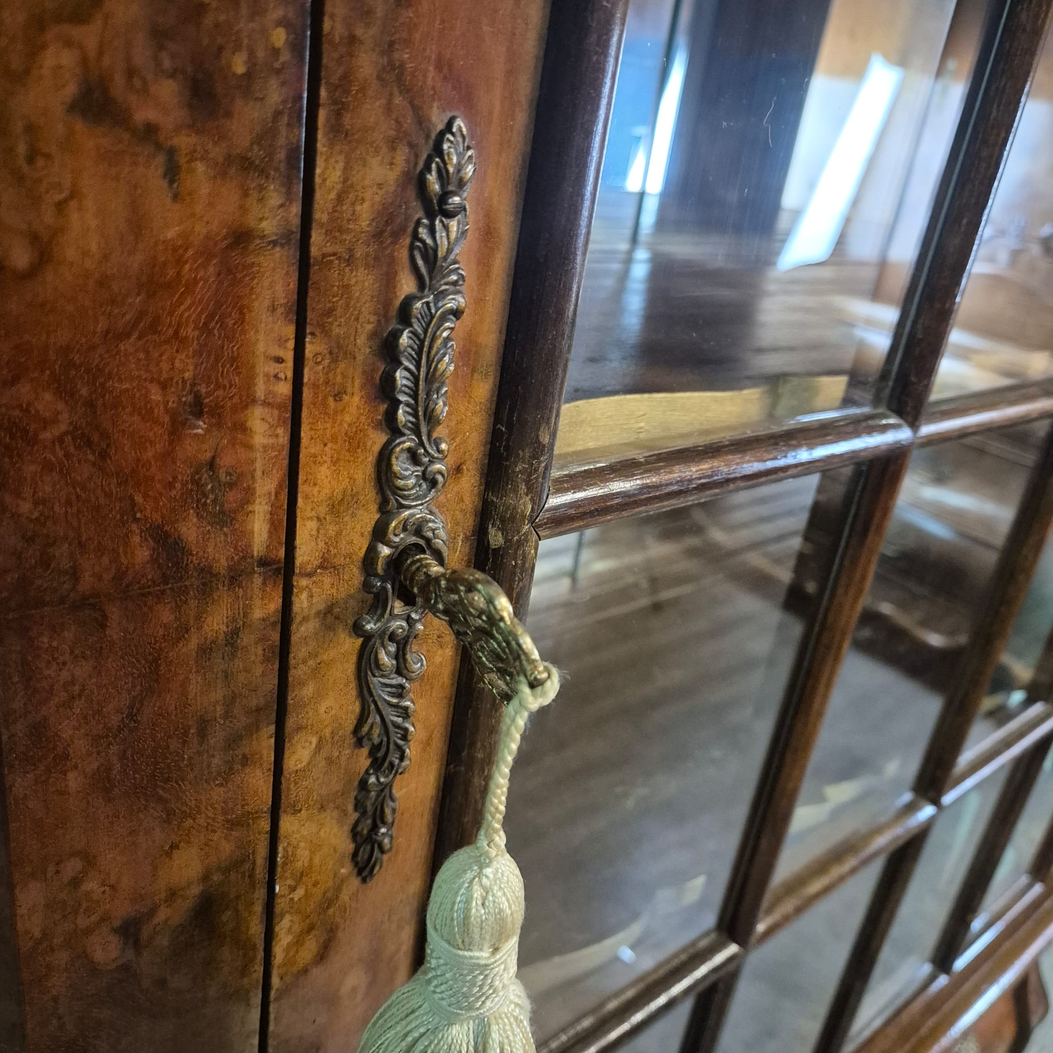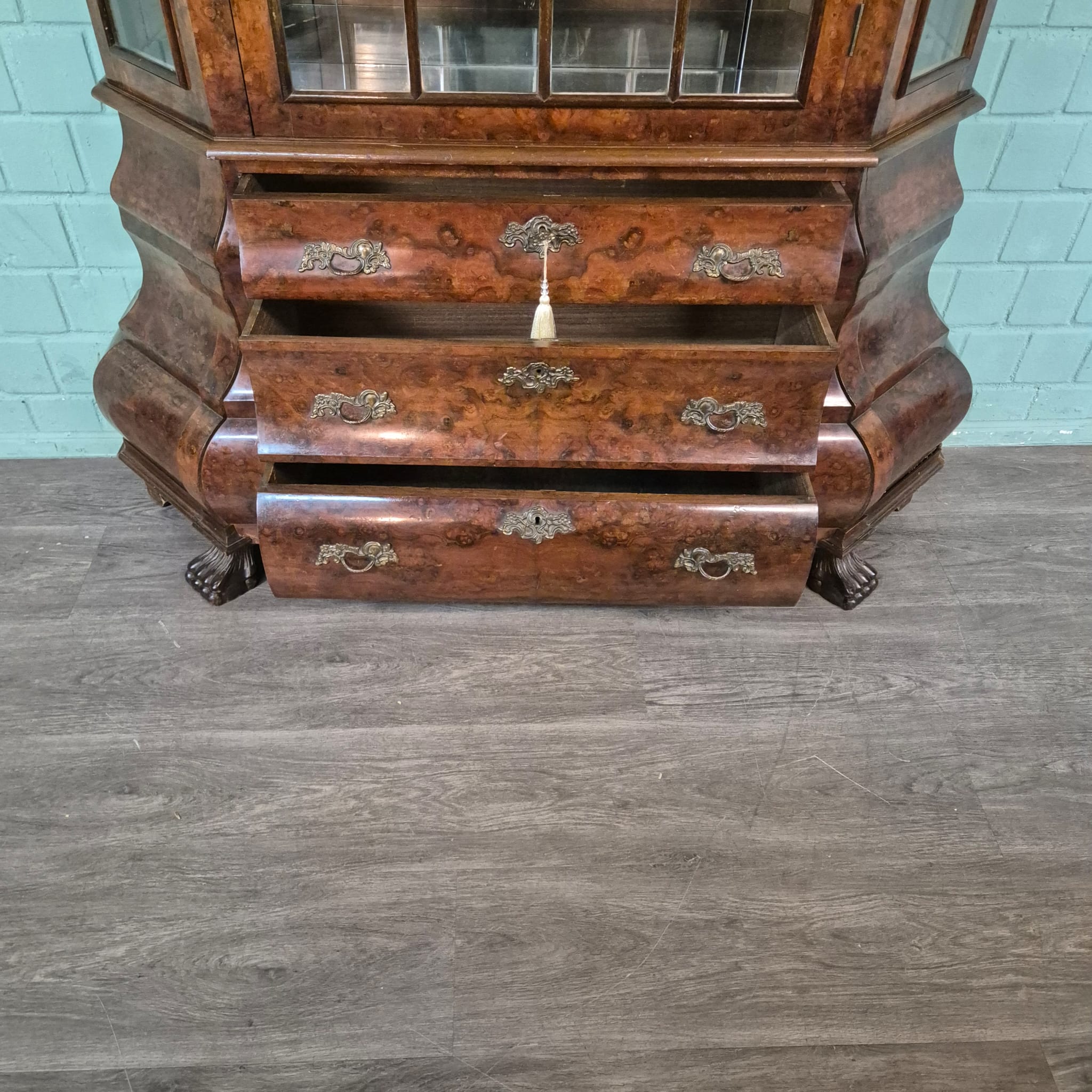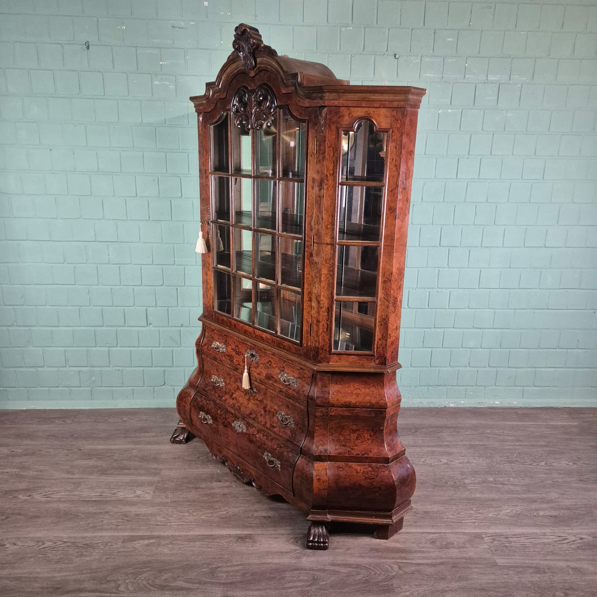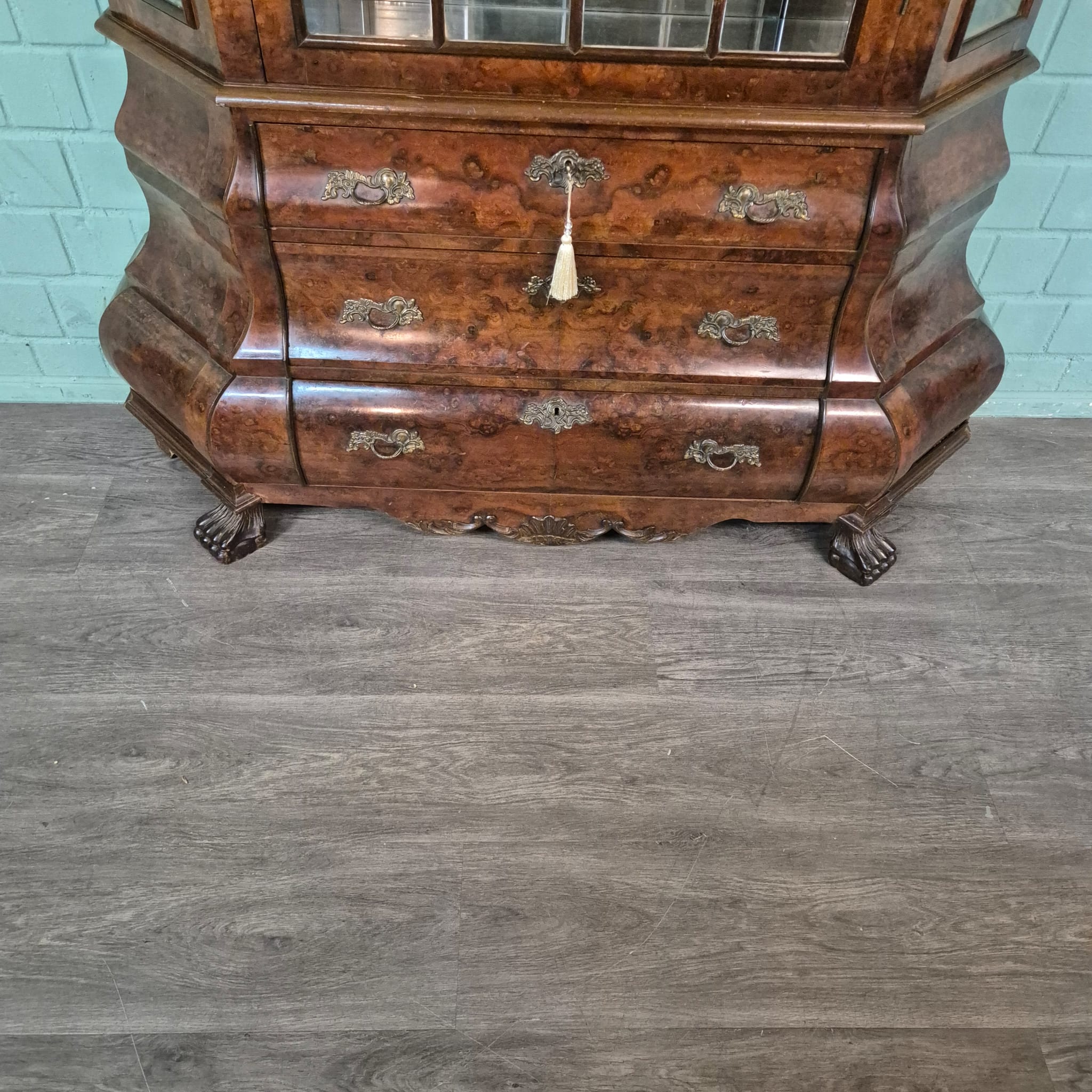 Stijlvolle neo-barok vitrine noten gefineerd en gelakt uit ca. 1970. De kast is in een goede staat en heeft lichte gebruikssporen. Demontabel (2-delig).