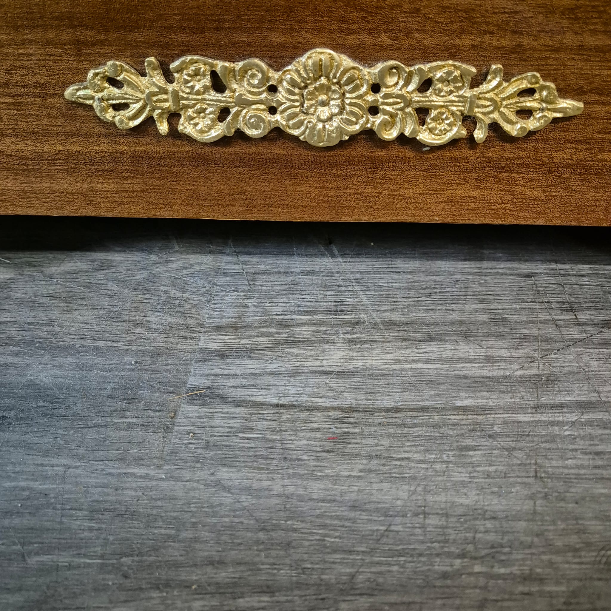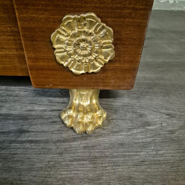 Toepassingen en beslag: Uitgebreide decoratieve lijstwerken en ornamenten van brons en messing verfraaien het meubelstuk en benadrukken het luxueuze karakter. Bijzonder opvallend zijn de gedetailleerde kapitelen op de zuilen en het beslag in het onderste gedeelte.