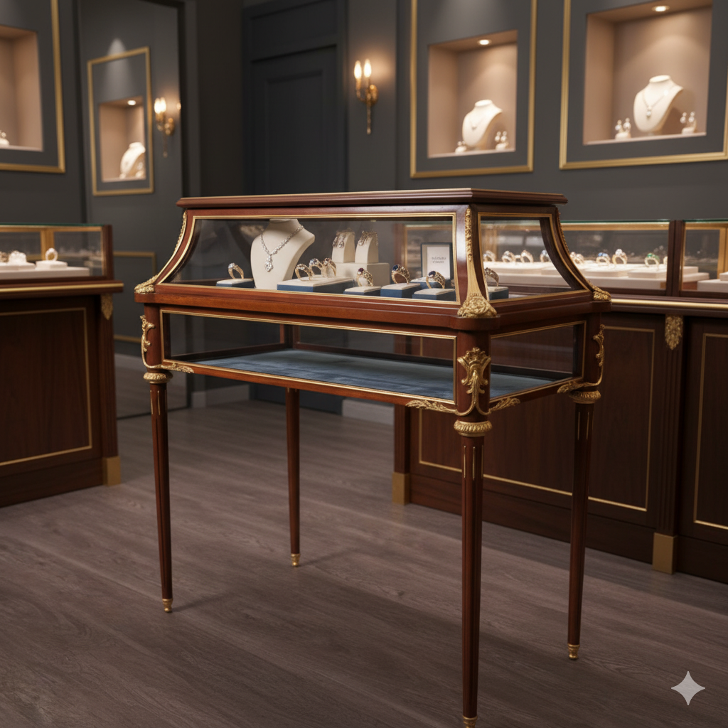 Prachtige vitrinekast van massief mahoniehout met bronzen beslag – Nieuw en Luxe