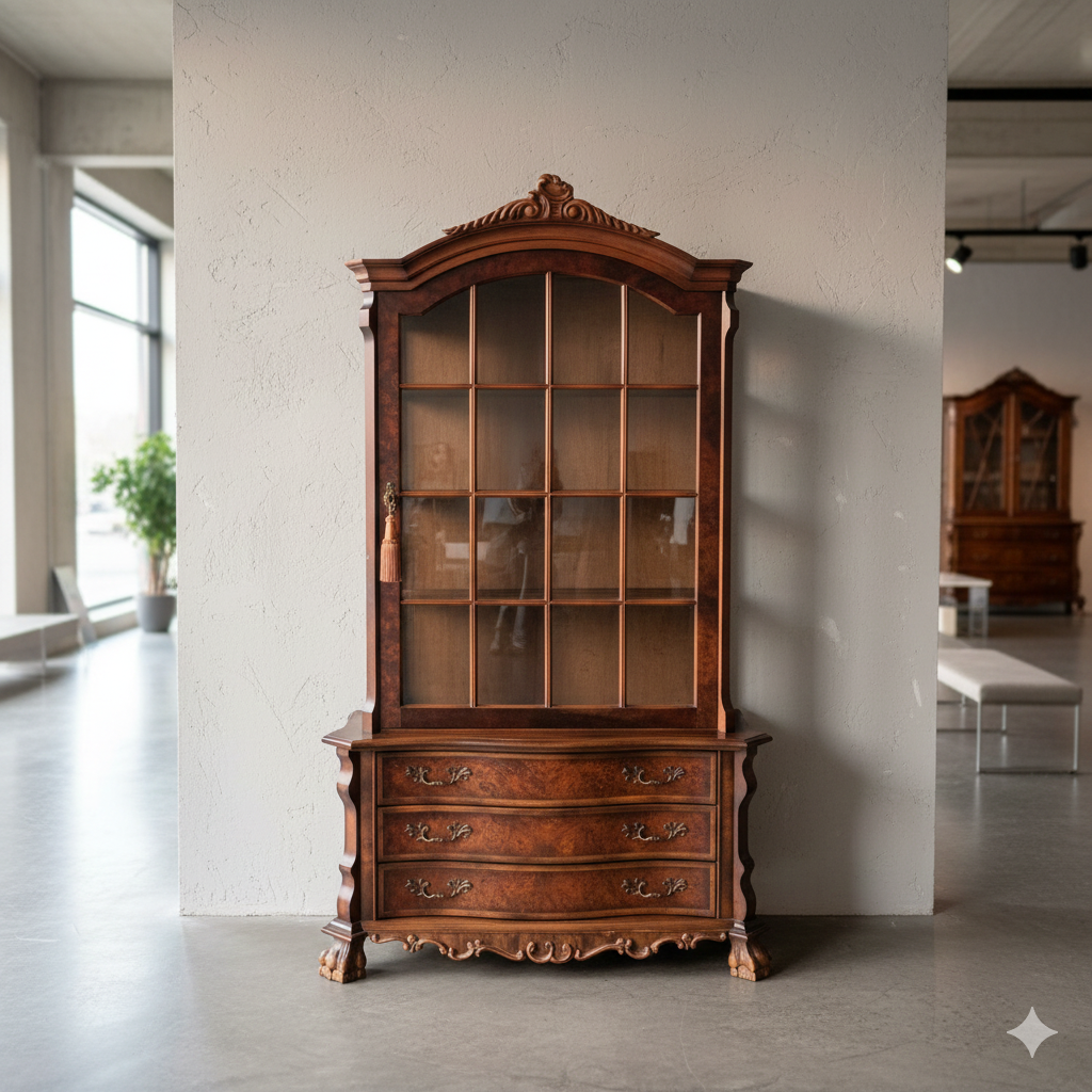 Stijlvolle neo-barok vitrinekast noten gefineerd en gelakt uit ca. 1960. De kast is in een zeer goede staat en heeft minimale gebruikssporen. Demontabel (2-delig).