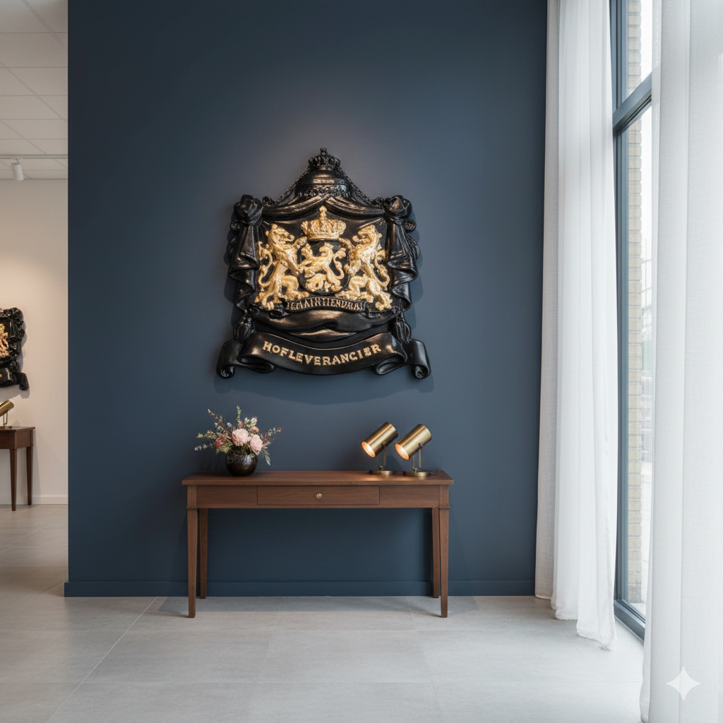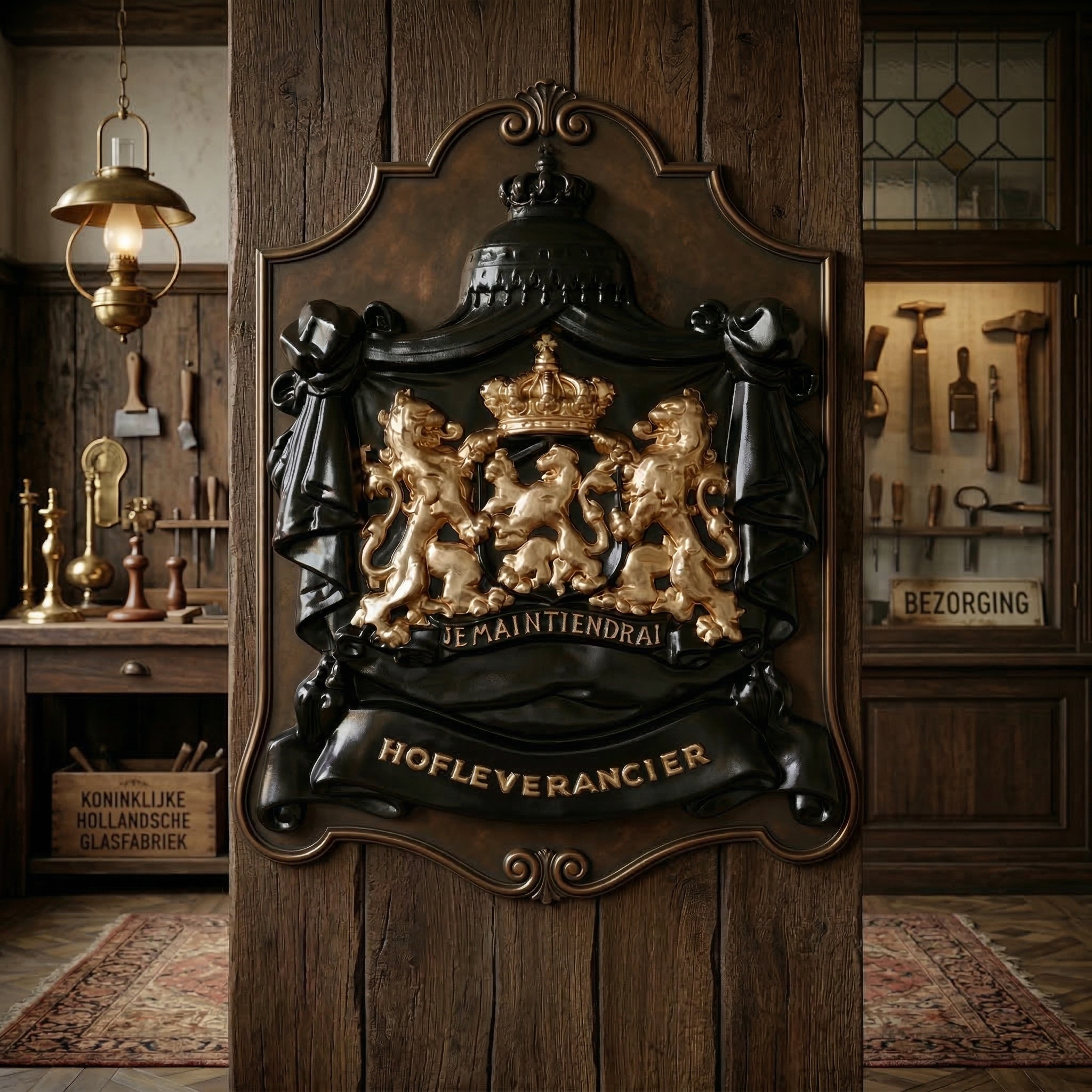 Koninklijk wapenschild gemaakt van aluminium met het opschrift Je Maintiendrai (ik zal handhaven) en Hofleverancier (leverancier aan het koninklijk huis).