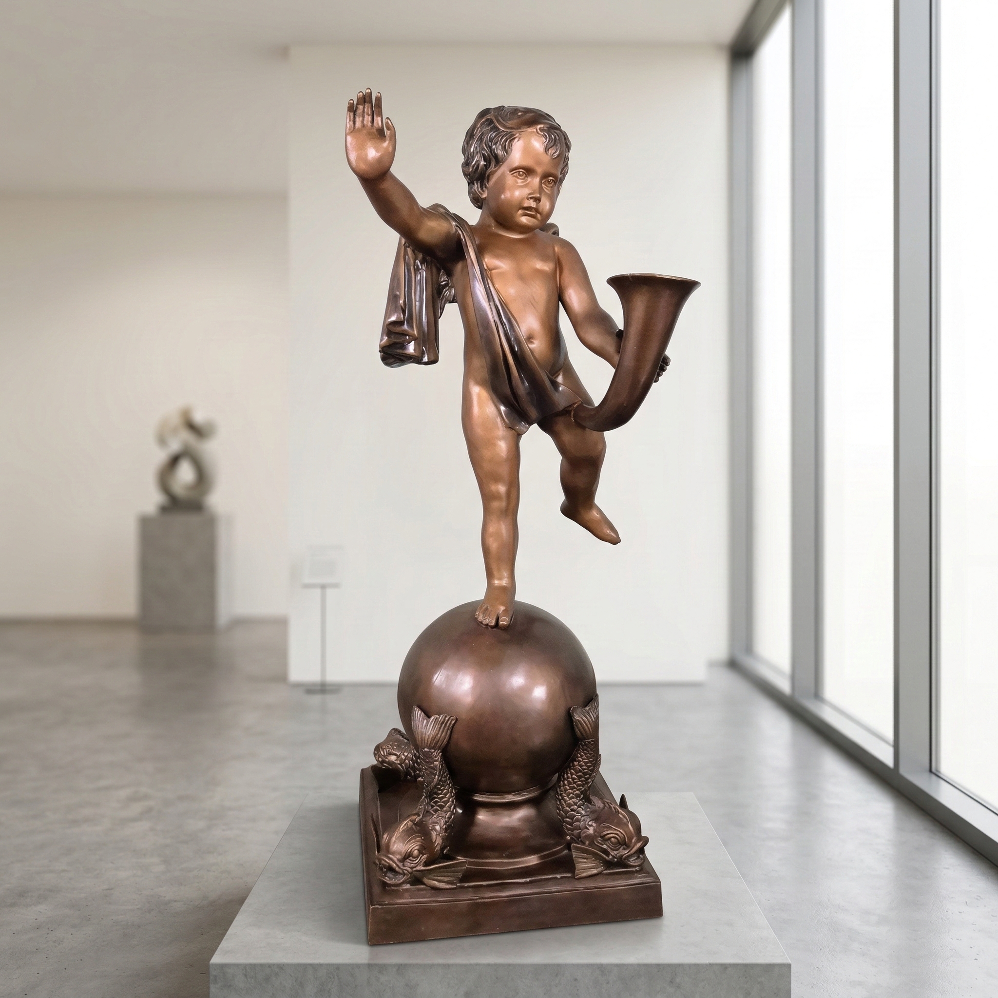 Tijdloze charme: deze prachtige bronzen uitloop is een waar meesterwerk van de kunstgieterij. Het schattige jongetje (putti), dat op een bal balanceert en met een schelp water uitdeelt, is een tijdloze klassieker. Het gedetailleerde ontwerp en de hoogwaardige patina geven de speer een antieke charme.