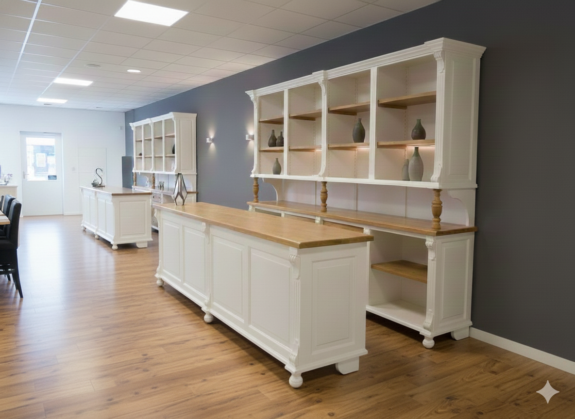 Winkelkast en toonbank model Mirjam wit grenen. De meubels worden compleet geleverd en zijn direct gereed voor gebruik.