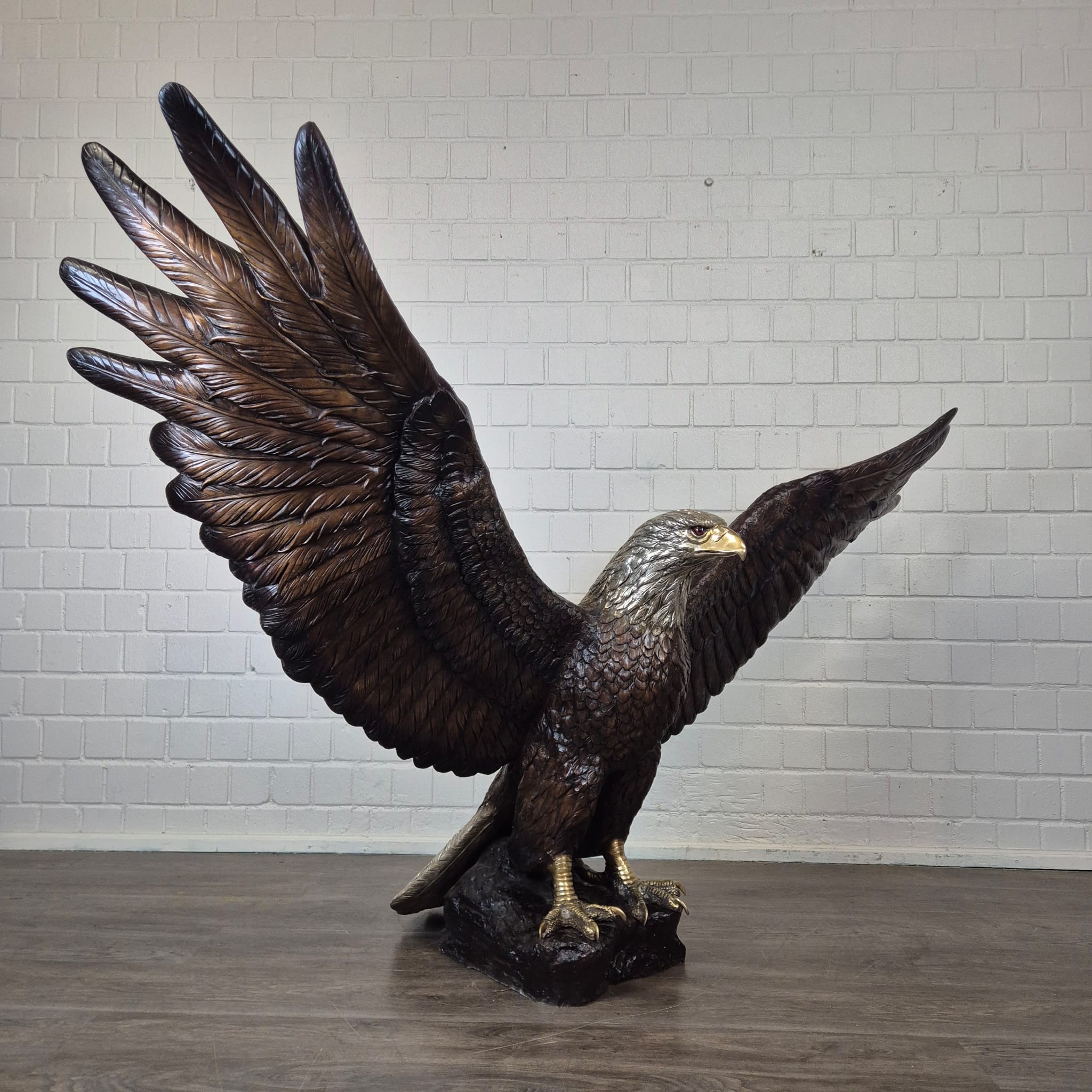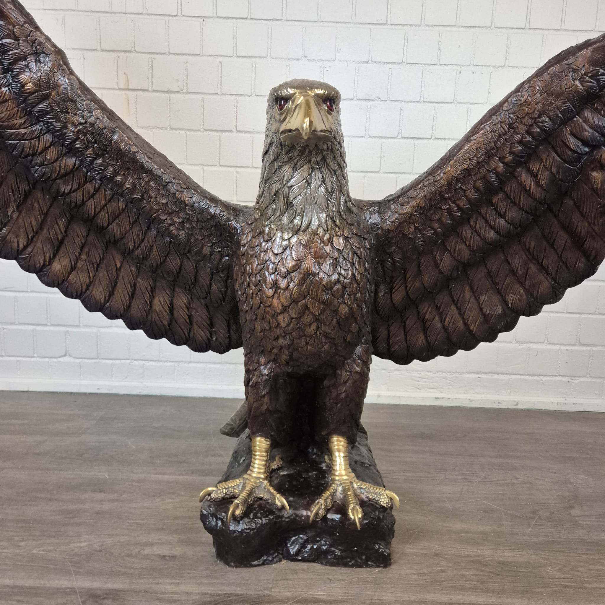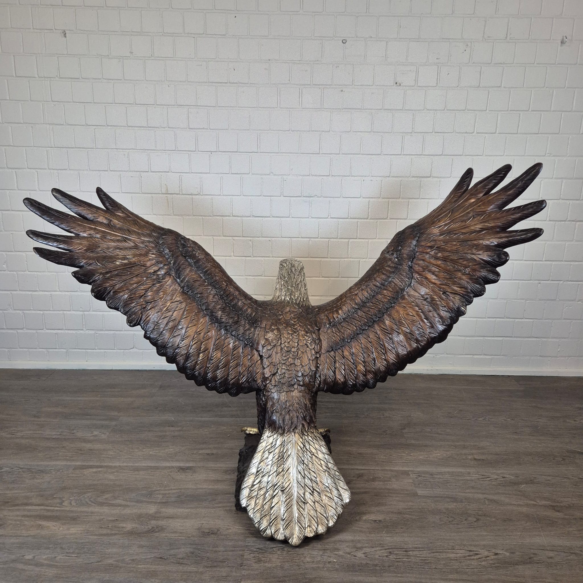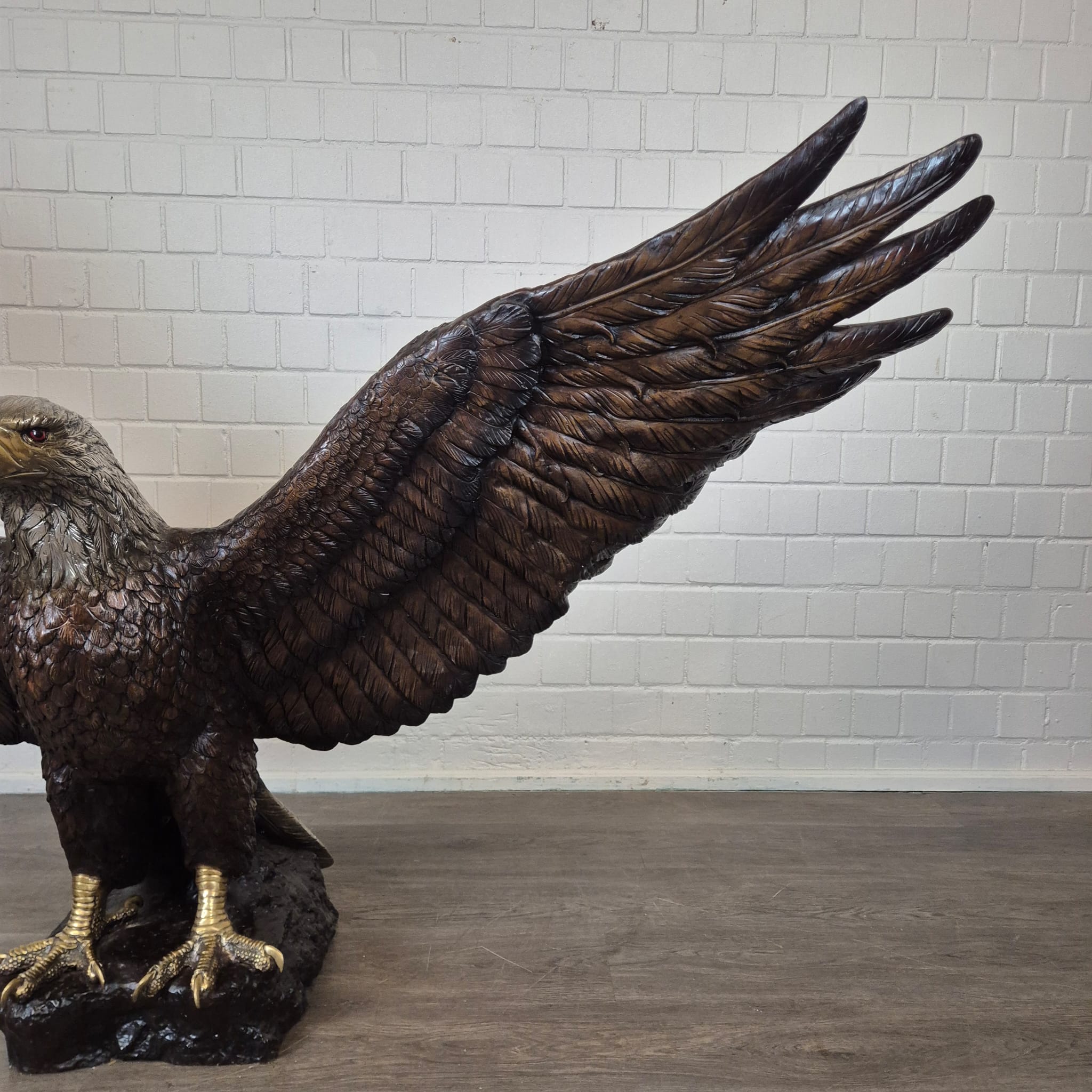 Haal een iconisch symbool in huis. Deze imposante sculptuur van een Amerikaanse zeearend, het majestueuze symbool van de VS, betovert met zijn krachtige uitstraling en minutieuze details. Met een indrukwekkende spanwijdte van 2,20 meter is dit kunstwerk een ware blikvanger voor statige entrees, uitgestrekte tuinen of exclusieve bedrijfspanden.